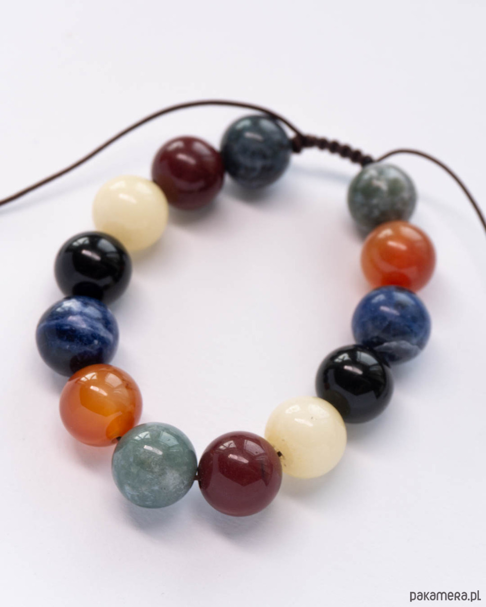 Bransoletka z pięknych dużych kamieni naturalnych wielokolorowa: agat, karneol, sodalit, onyks, jadeit, mokait.