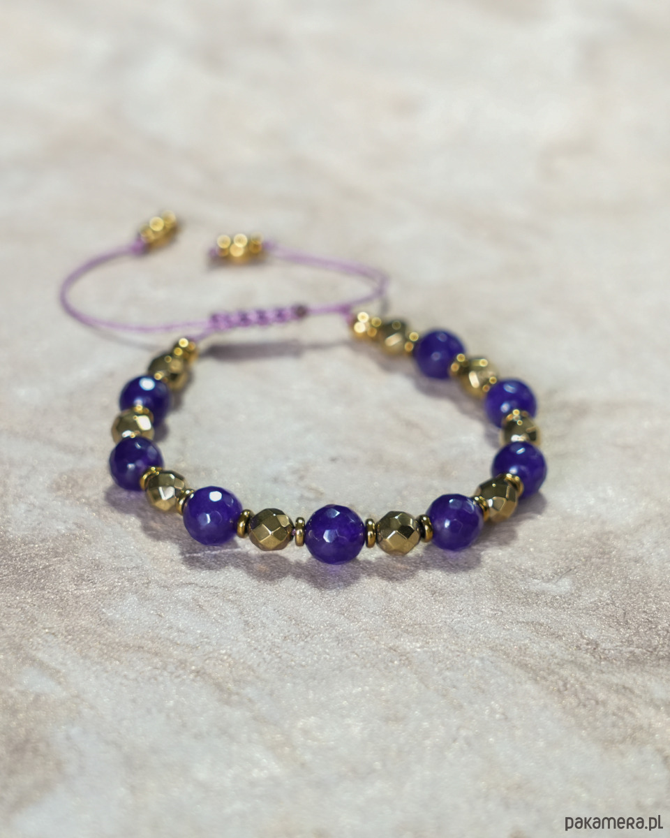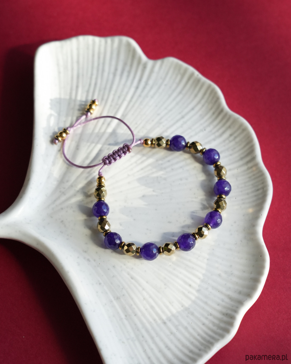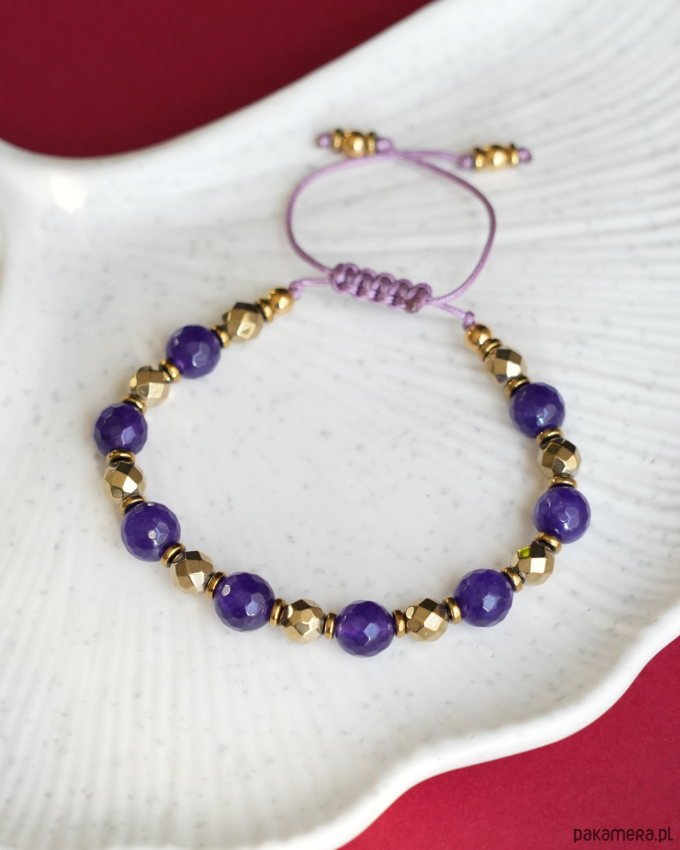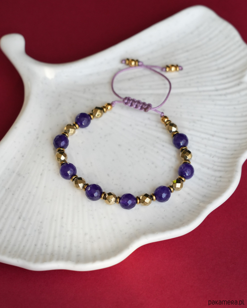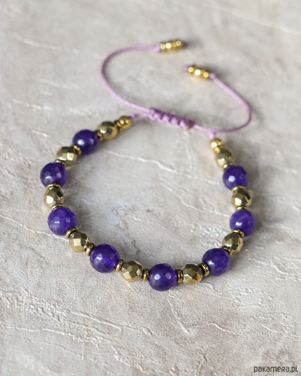 Wyjątkowa, energetyczna bransoletka z fioletowym JADEITEM i złotym HEMATYTEM. Kamienie mają fasetowane wykończenie, dzięki czemu pięknie odbijają światło. Koraliki są nawleczone na mocny sznureczek w kolorze wrzosowym.