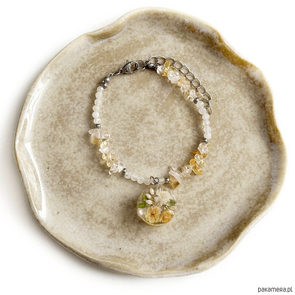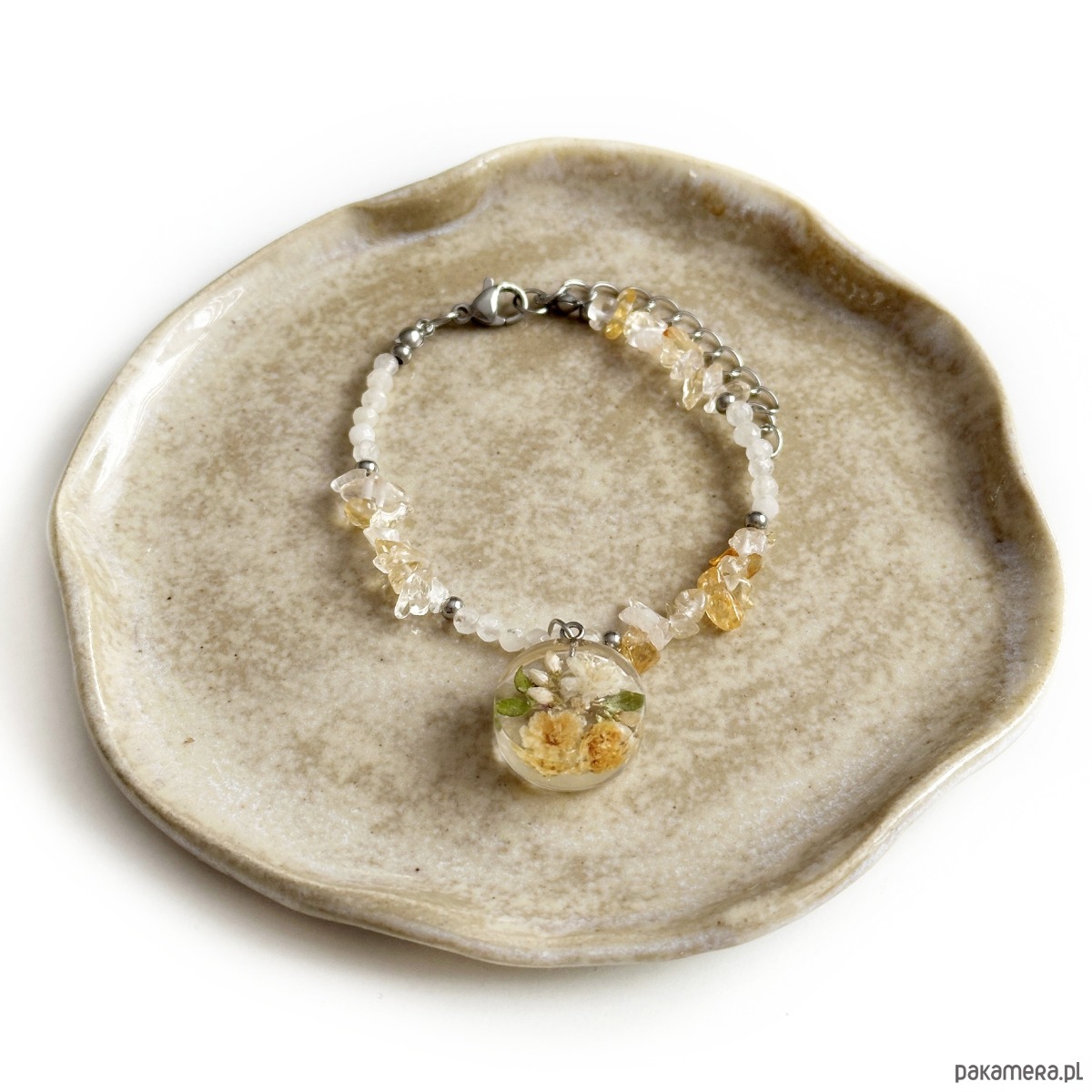 Materiały – suszone kwiaty, stal szlachetna kamienie naturalne, żywica epoksydowa