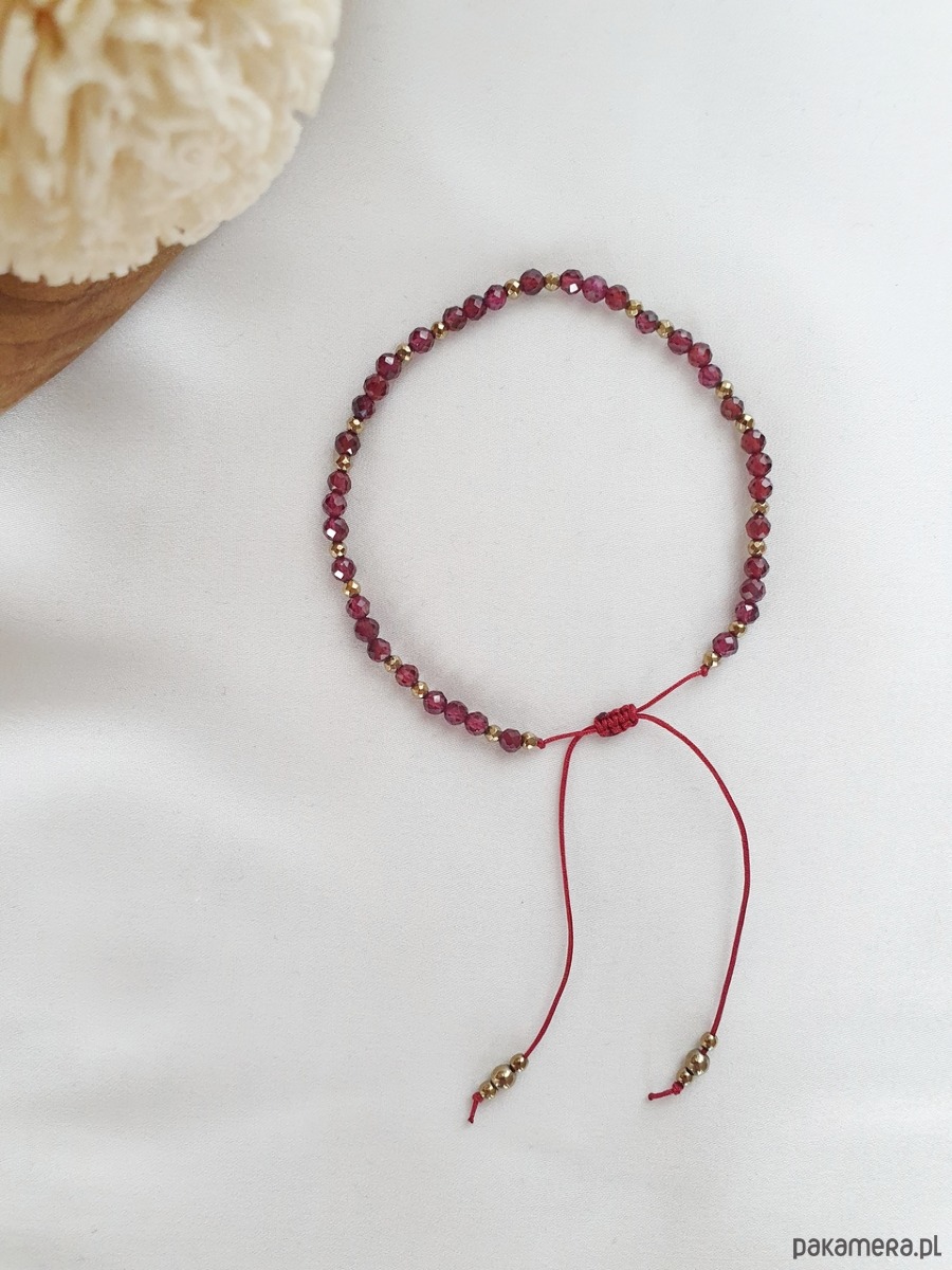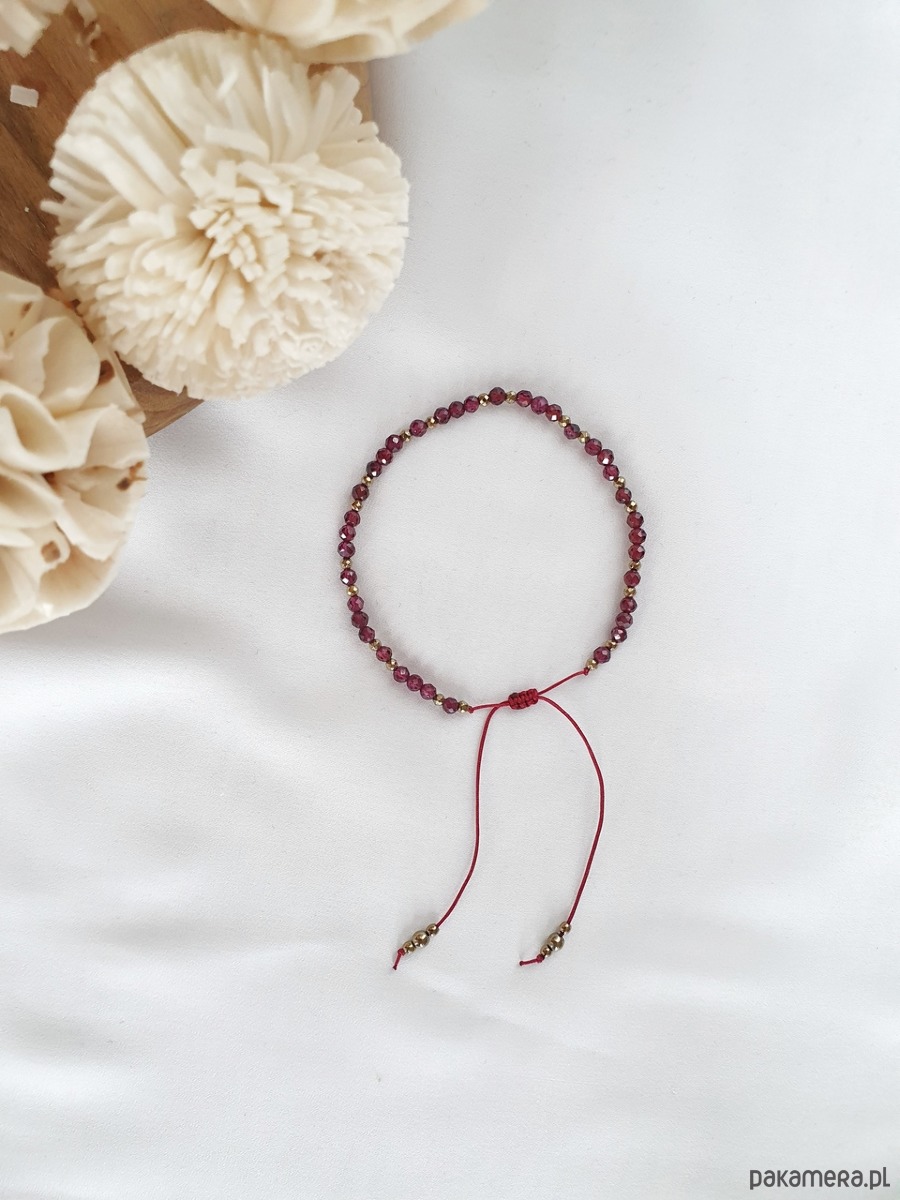 Bransoletka na wytrzymałej nici jubilerskiej z kamieniami naturalnymi: granatem i hematytem. Regulowane zapięcie pozwala na dowolne dopasowanie do nadgarstka.