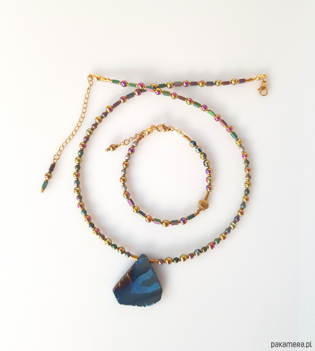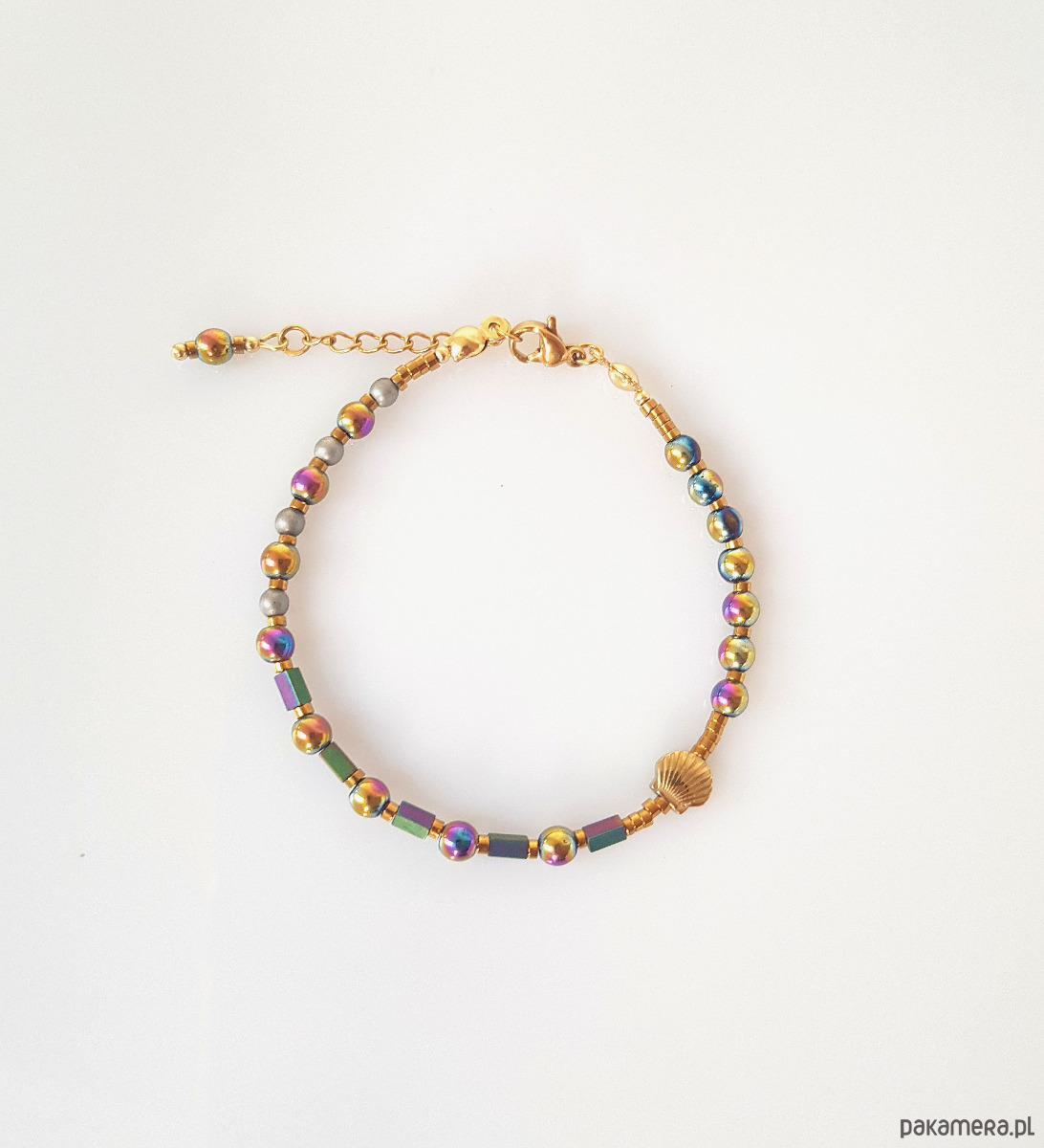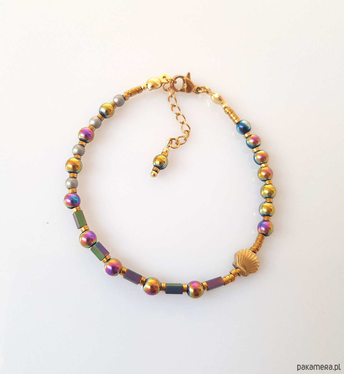 Mix galwanizowanych hematytów o metalicznym połysku z wplecioną muszelką z hematytu.
