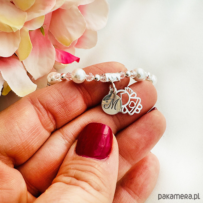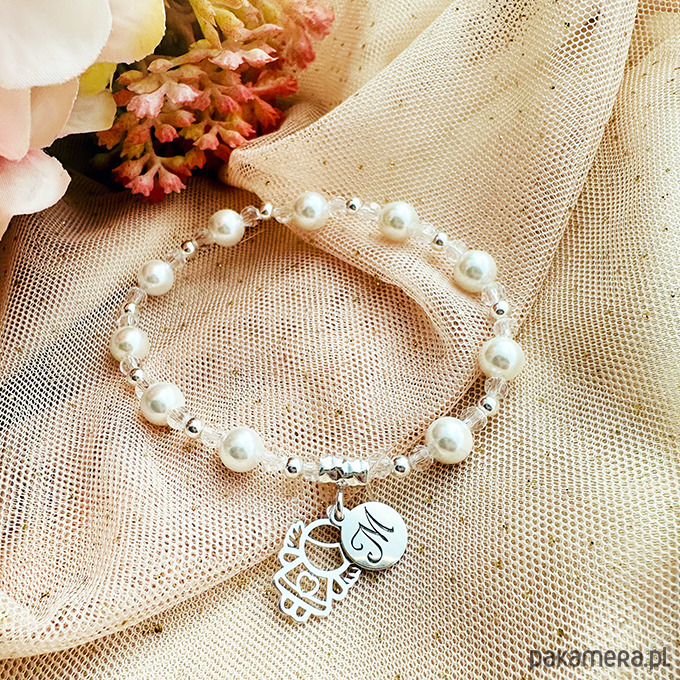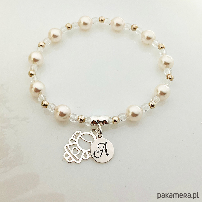 Bransoletka z inicjałem Różaniec KOMUNIA aniołek