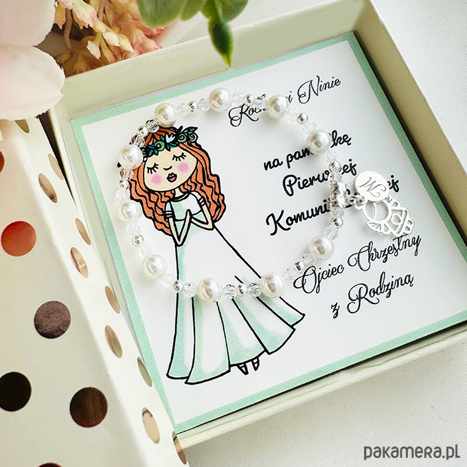 Wyjątkowy unikalny prezent z okazji Pierwszej Komunii lub Chrztu. Zawiera piękny różaniec bransoletkę z pereł GAVBARI PEARLS z wybranym inicjałem i krzyżykiem ze srebra 925 oraz opcjonalnie wykonaną ręcznie kartę z życzeniami.