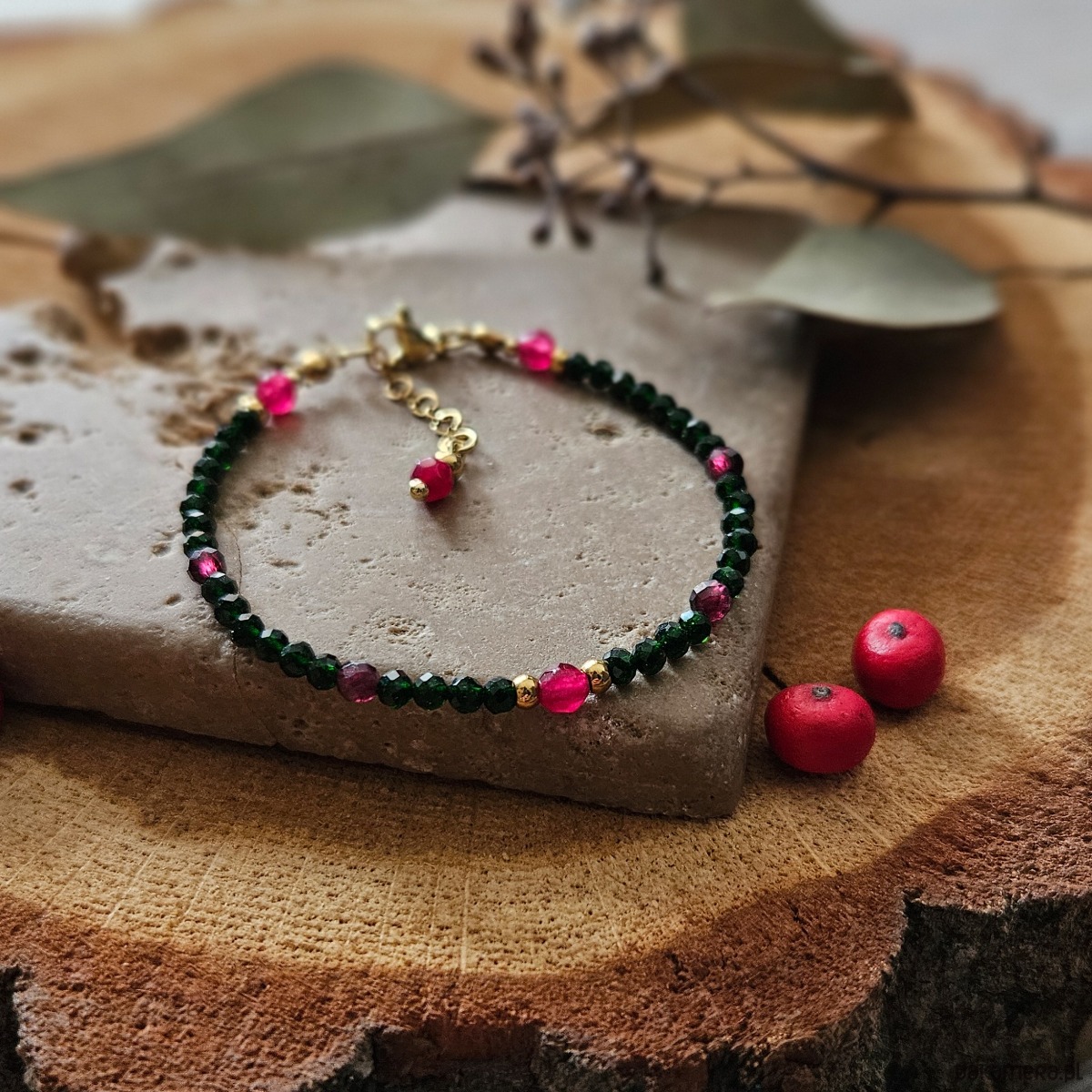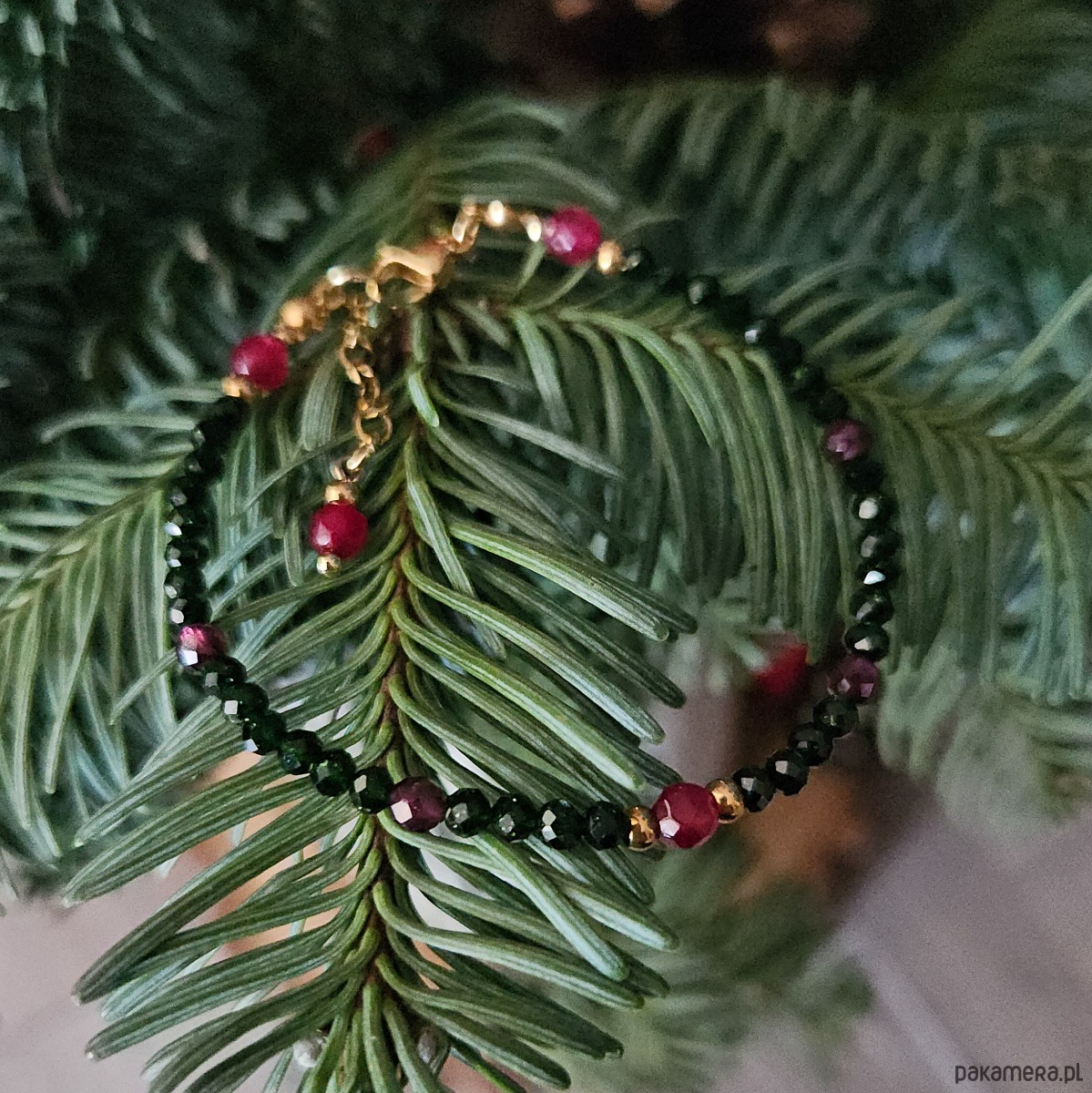 Elegancka bransoletka łącząca w sobie szmaragd Nilu, jadeit i granat. Połączenie głębokich odcieni butelkowej zieleni, bordo oraz radosnej czerwieni to klasyk, który nigdy nie wychodzi z mody! A wszystko to uzupełnione dodatkami ze stali szlachetnej w kolorze złotym. Bransoletka posiada także łańcuszek regulacyjny, łączący funkcjonalność z pięknym, dekoracyjnym elementem w postaci koralika z jadeitu. Będzie idealna na prezent!