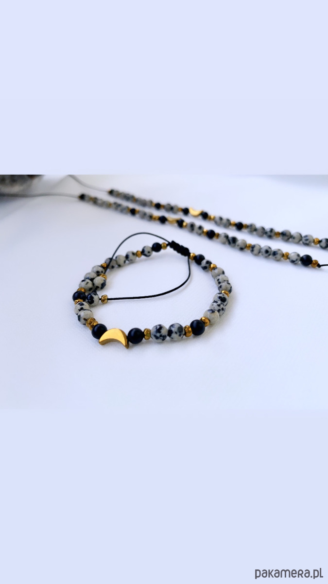 ▪️Użyte kamienie są naturalne i starannie wyselekcjonowane, ich wielkość wynosi około 4mm. Złote przekładki to hematyty oraz księżyc z hematytu o wielkości 7mm.