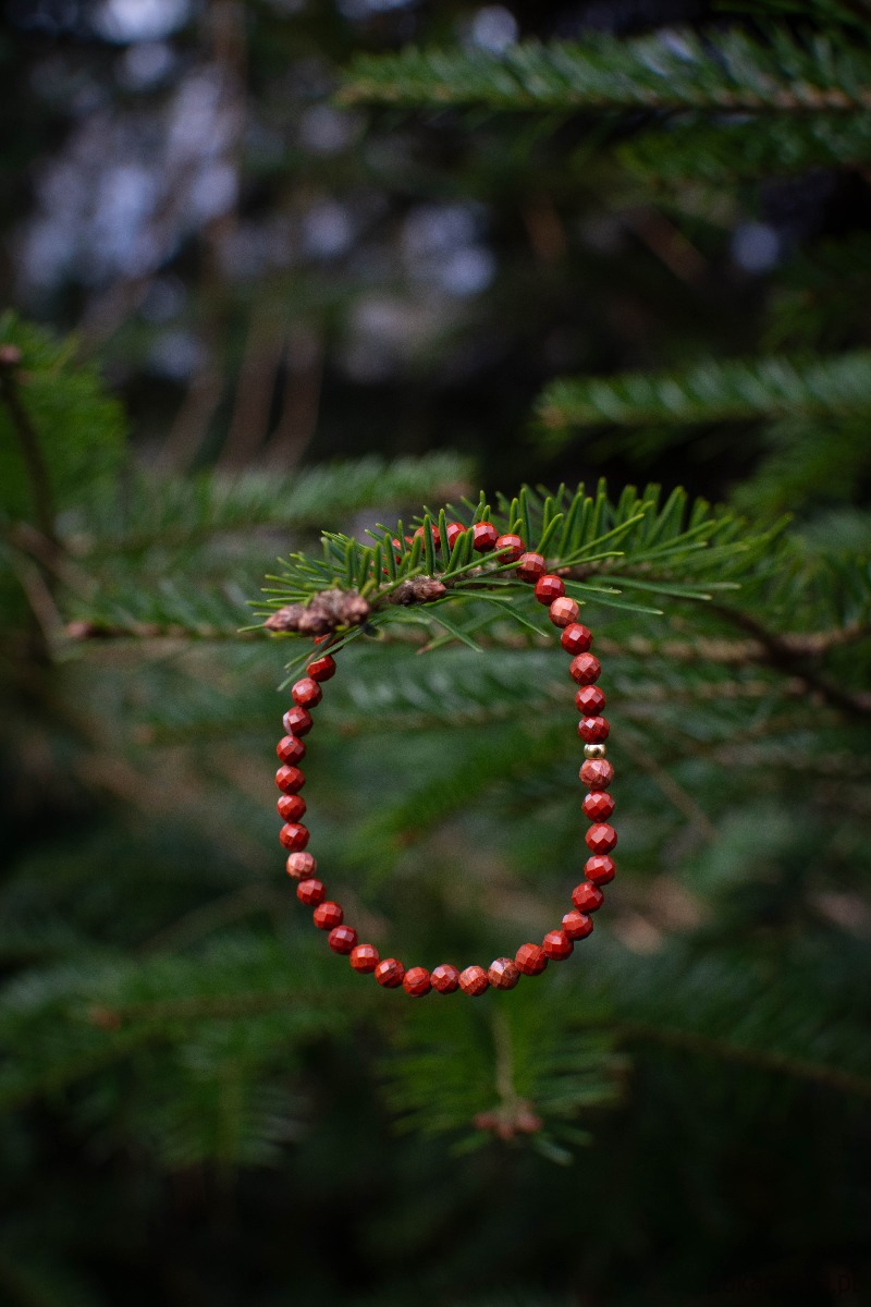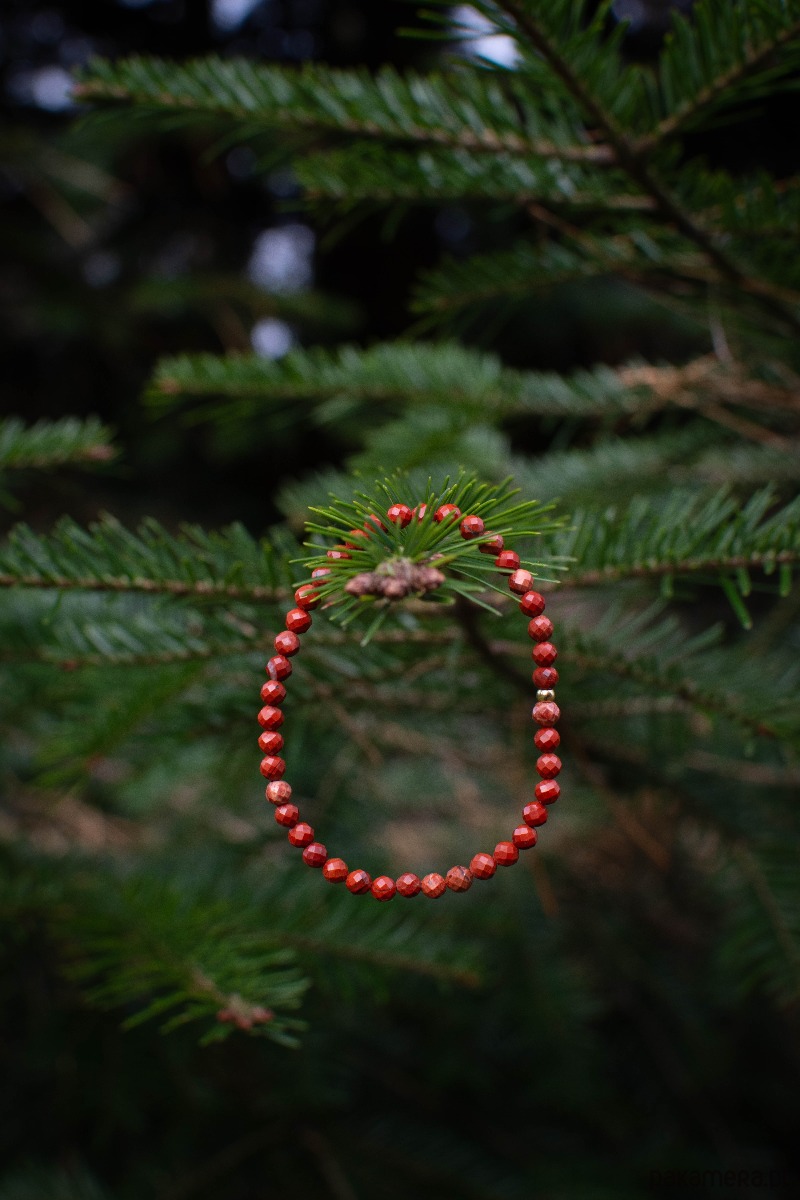 Materiały ~ elastyczna gumka jubilerska, fasetowany jaspis czerwony, złoty element ze stali szlachetnej.