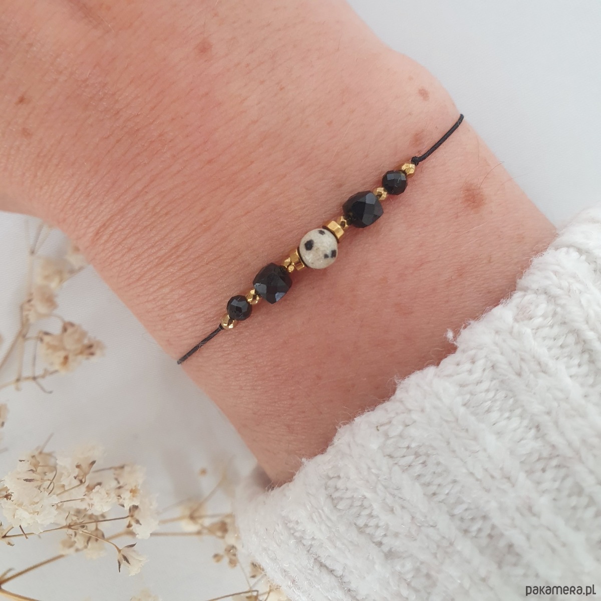 Bransoletka na wytrzymałej nitce jubilerskiej z kamieniami naturalnymi: TURMALINEM, JASPISEM DALMATYŃSKIM I HEMATYTEM. Regulowane zapięcie pozwala na dowolne dopasowanie do nadgarstka.