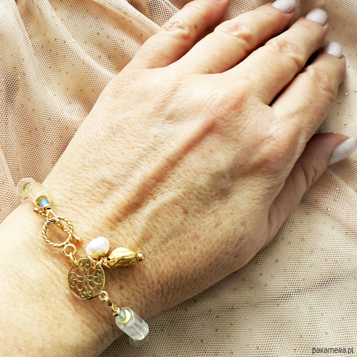 Bransoletka z kamieni , kryształ górski, perła, rozeta