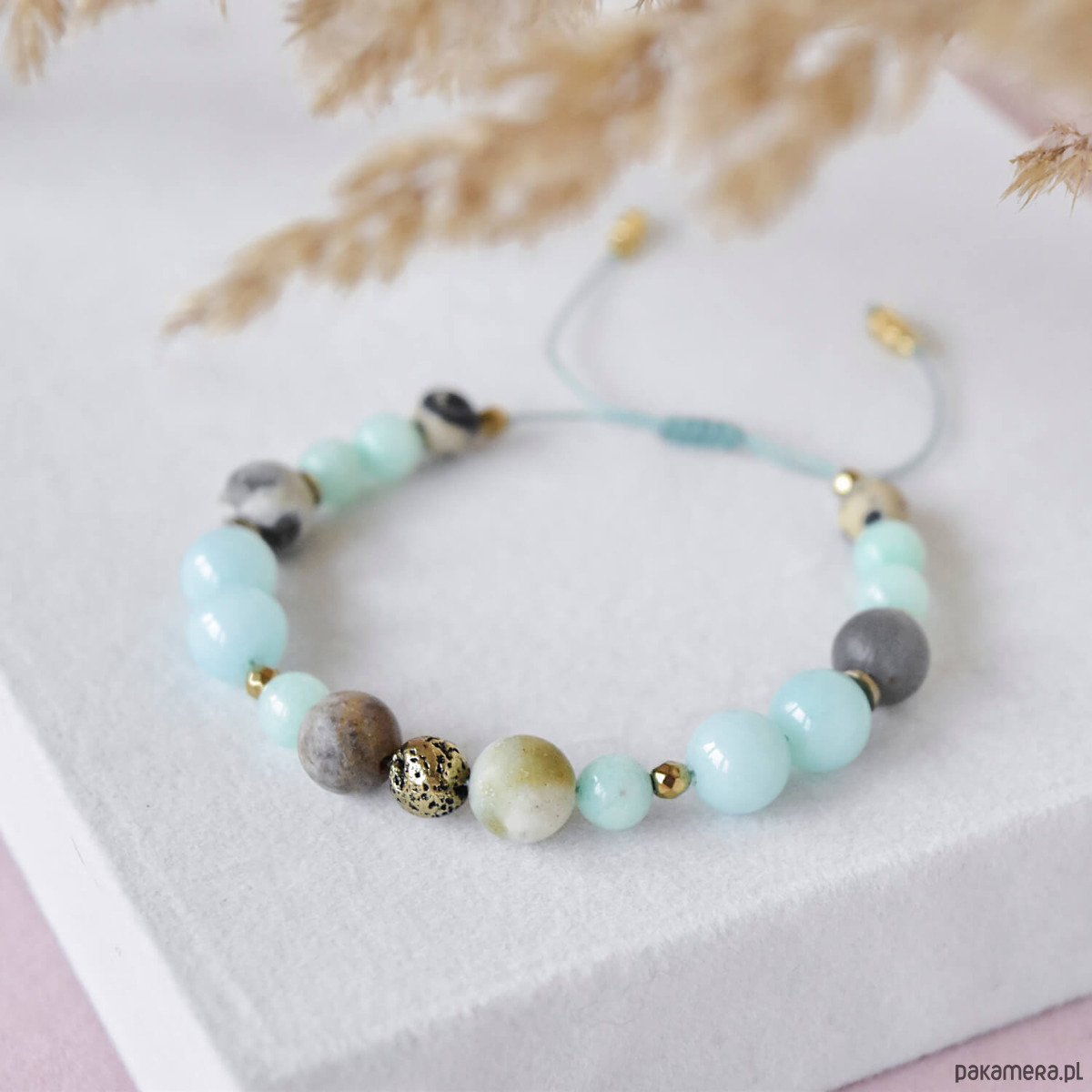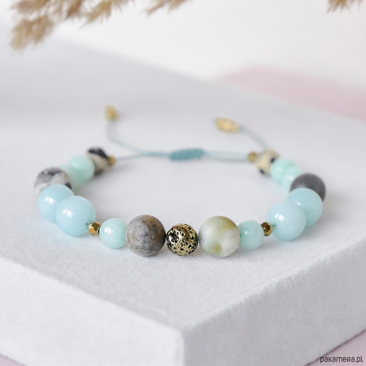 Bransoletka została wykonana ręcznie na wytrzymałym nylonowym sznurku, z regulowanym zapięciem makramowym, które pozwala wygodnie dopasować ją do nadgarstka. Jest lekka, komfortowa w noszeniu i doskonale sprawdzi się zarówno jako codzienny dodatek, jak i przemyślany prezent.