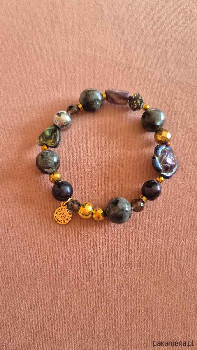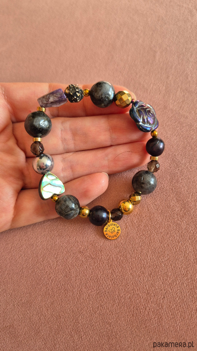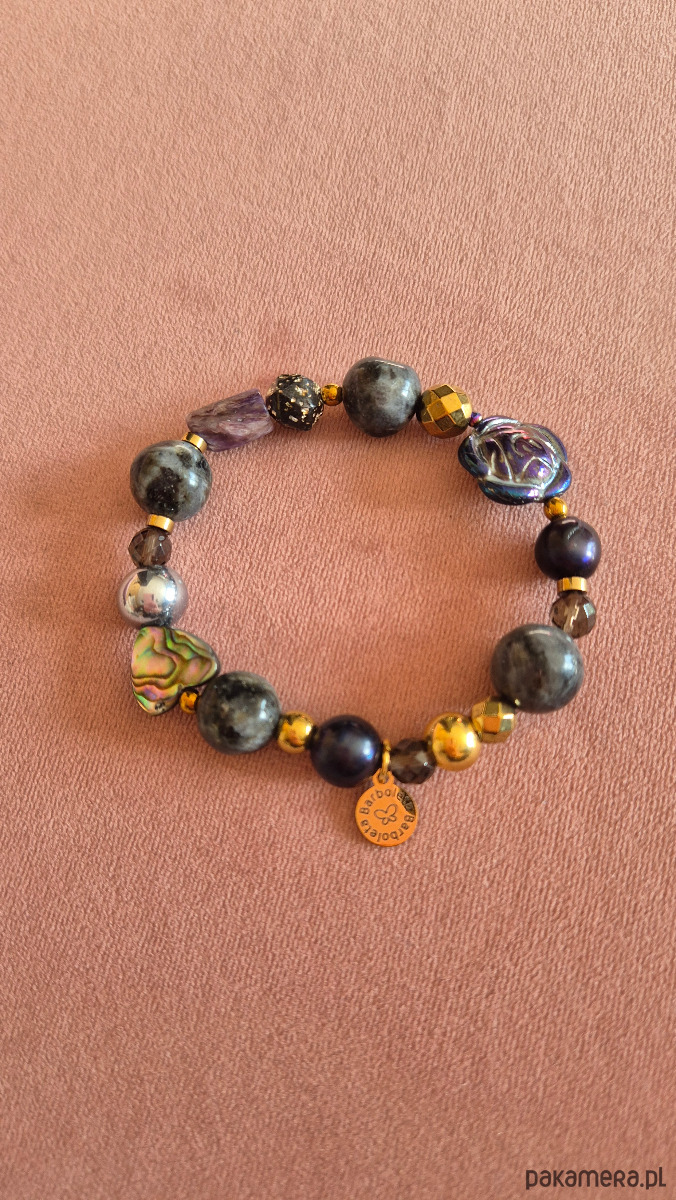 skład: Perły naturalne, labradoryty, hematyty, kwarc dymny,lawa wulkaniczna,muszla paua, agat, kwiat akrylowy. Elementy metalowe ze stali szlachetnej.