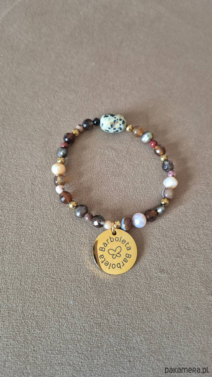 skład: jaspis dalmatyński hematyty, kwarc dymny, perły naturalne, agaty. Elementy metalowe ze stali szlachetnej.