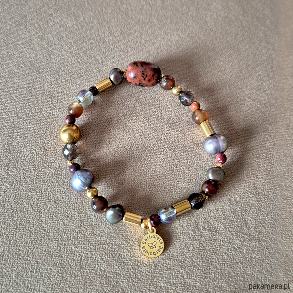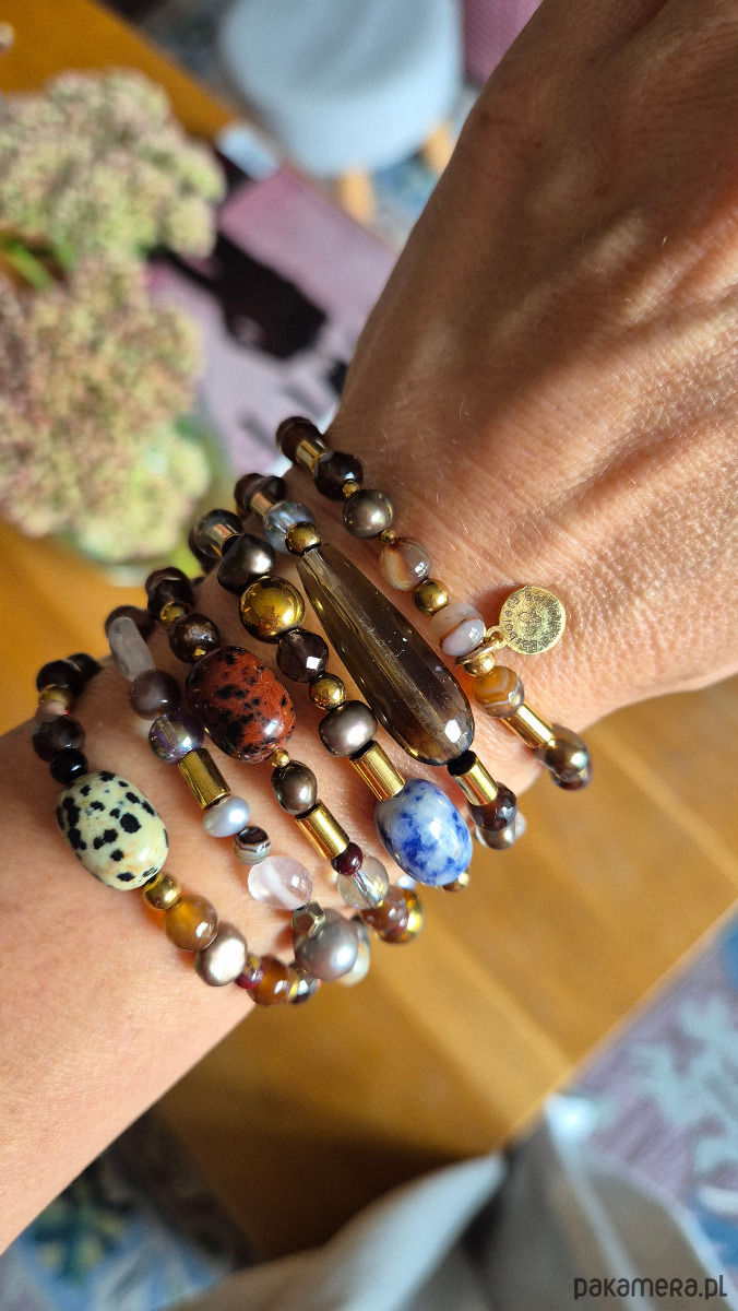 skład: lapis lazuli, hematyty, kwarc dymny, perły naturalne, agaty. Elementy metalowe ze stali szlachetnej.