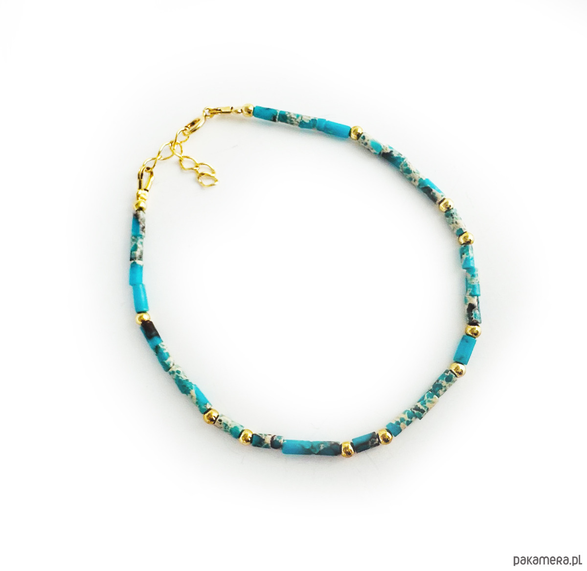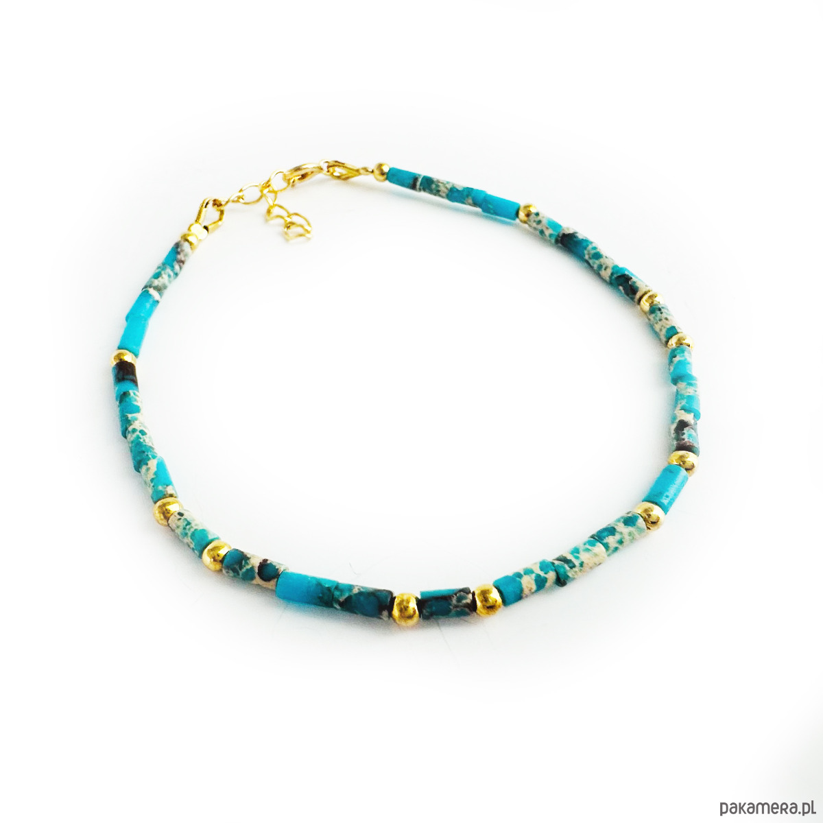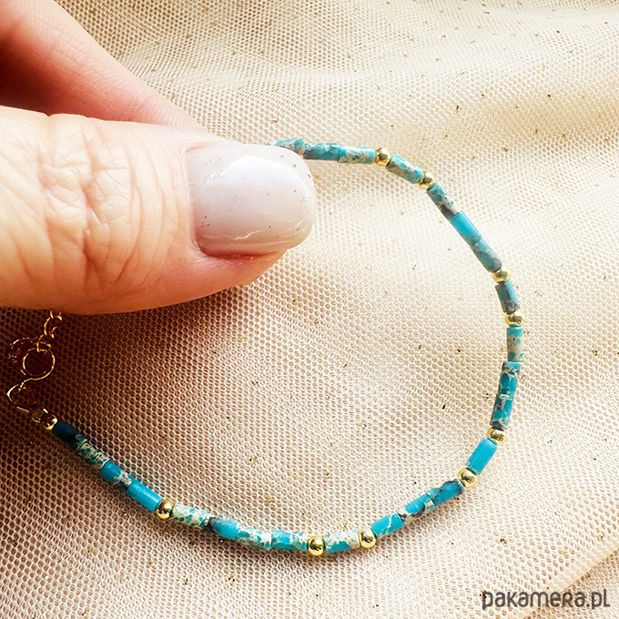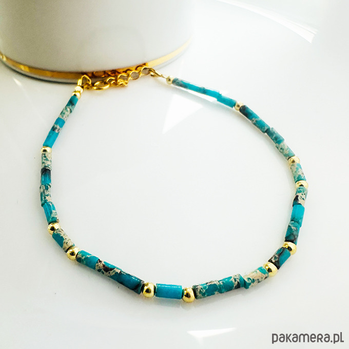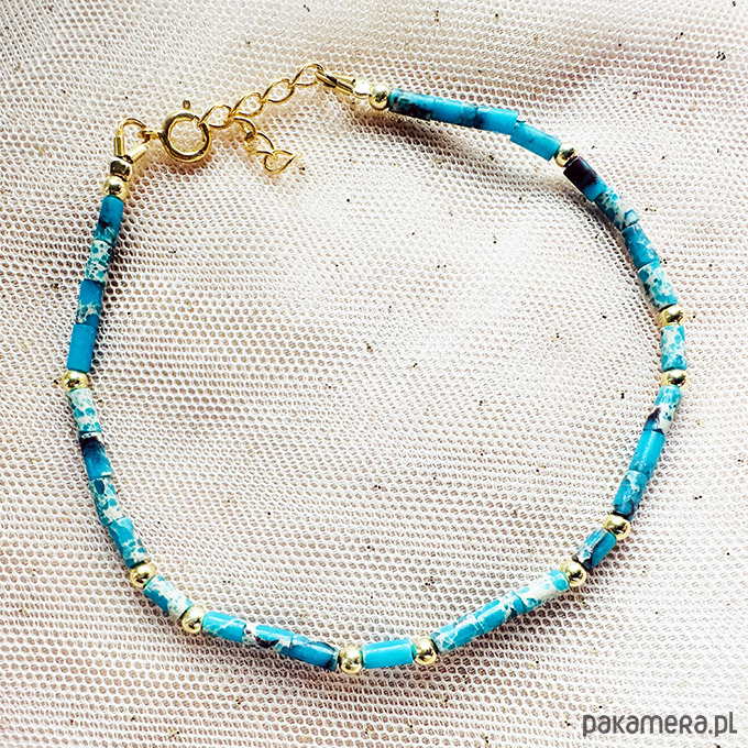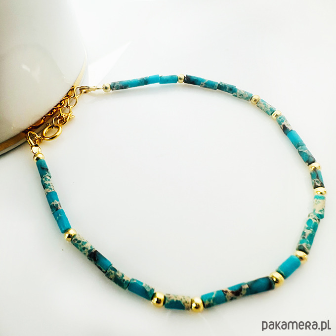 Bransoletka z Jaspisu cesarskiego w pięknych odcieniach turkusu. Wykonana ręcznie z kamieni i srebrnych złoconych 24 k złotem elementów.