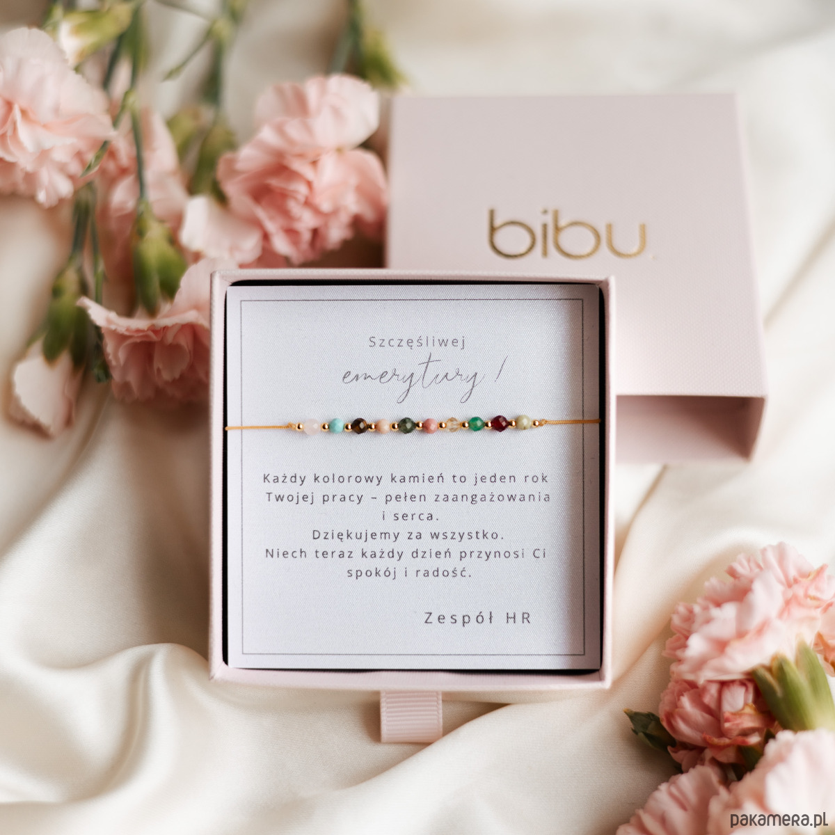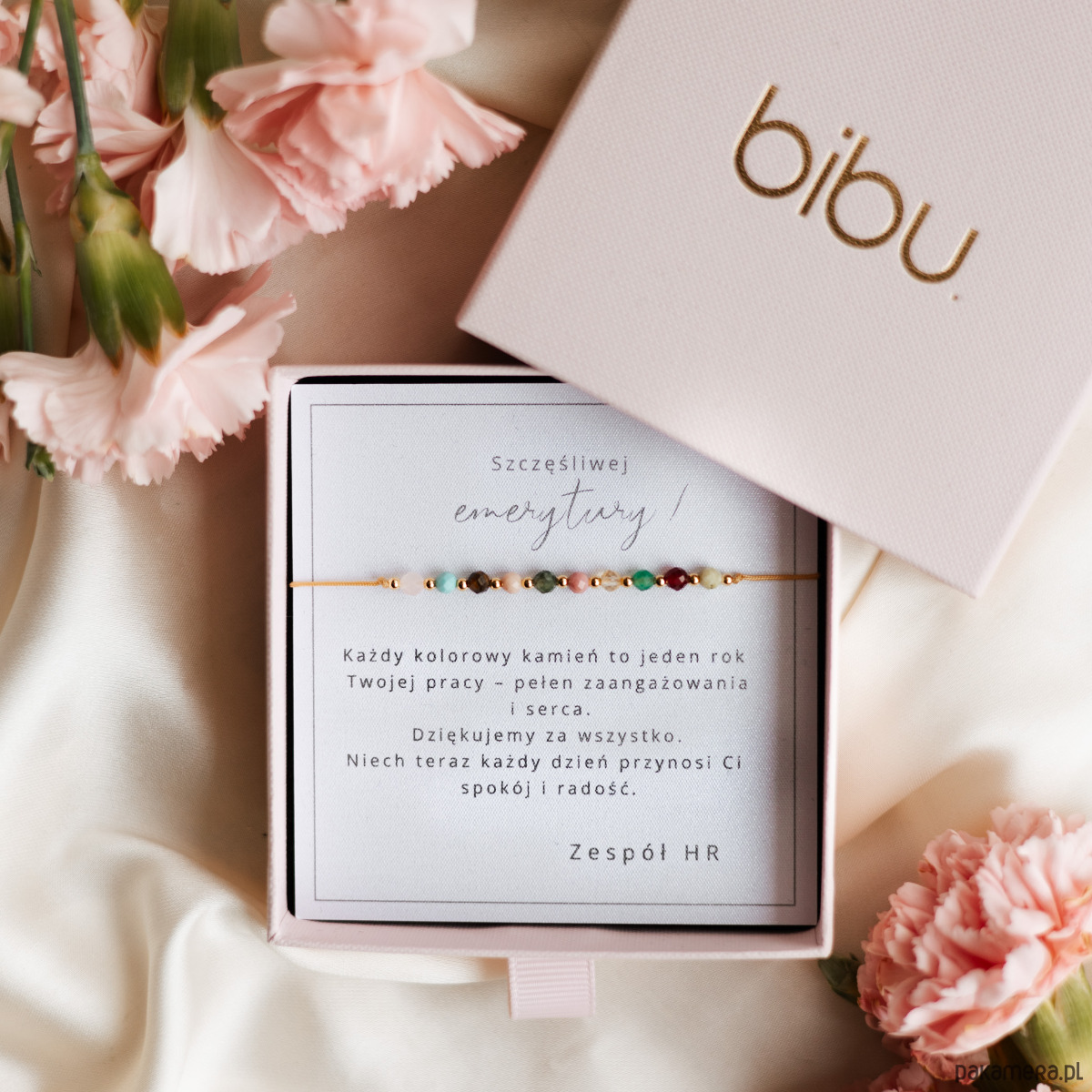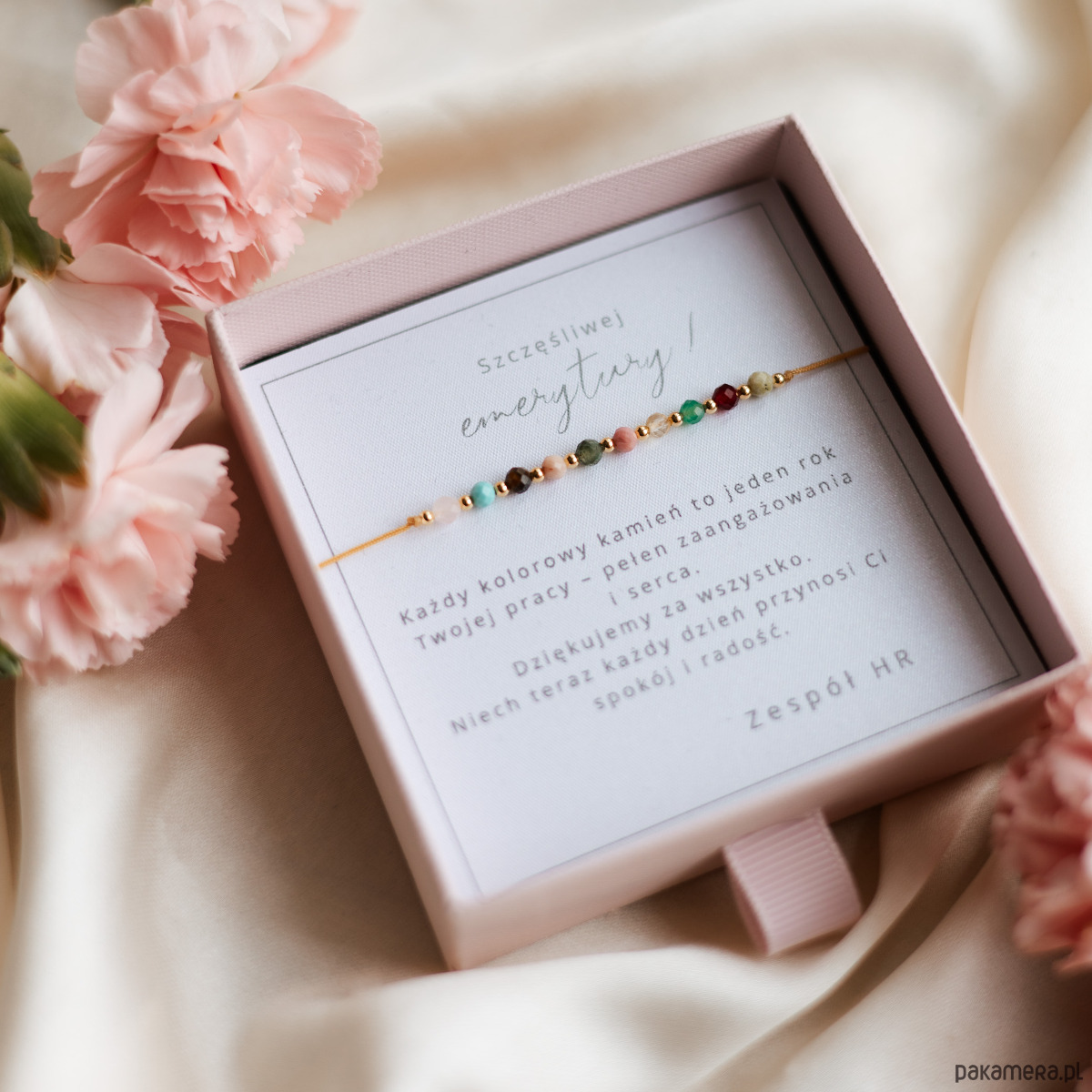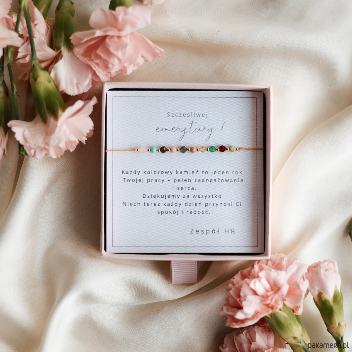 Bransoletka stworzona z myślą, aby uczcić jeden z najważniejszych momentów w życiu – przejście na emeryturę. Każdy kolorowy kamień symbolizuje jeden rok pracy, tworząc piękną i osobistą opowieść o latach zaangażowania, doświadczenia i sukcesów.