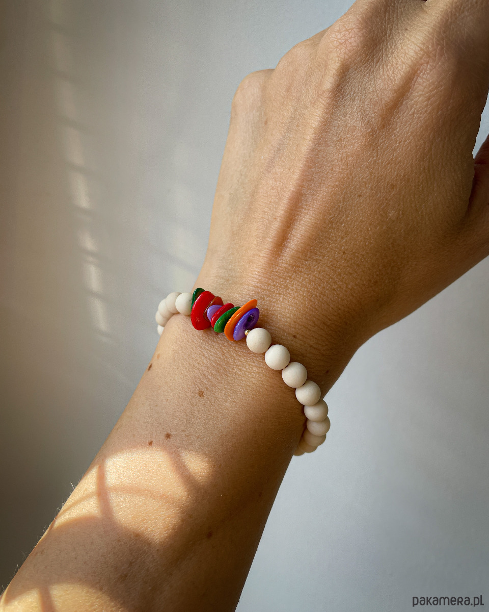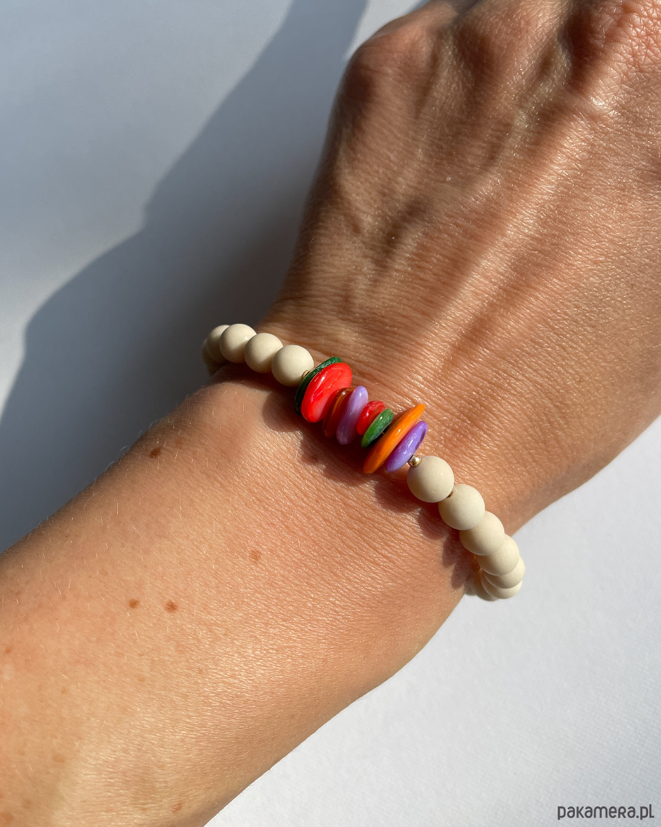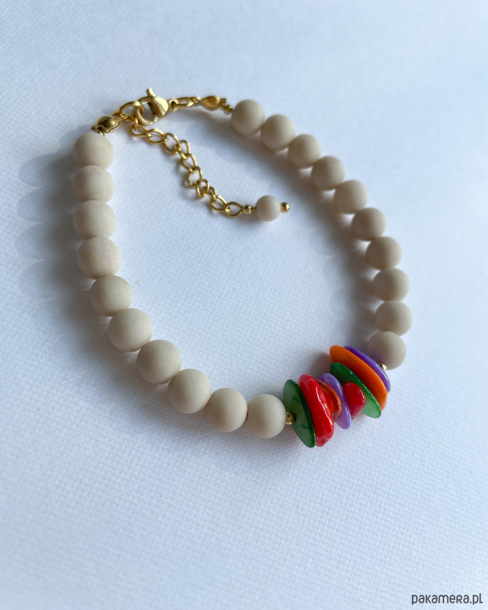 Bransoletka na lato z beżowego, matowego KAMIENIA RZECZNEGO i barwionej MASY PERŁOWEJ (muszli). Zapięcie, łańcuszek i złote kuleczki to STAL SZLACHETNA w kolorze złotym.