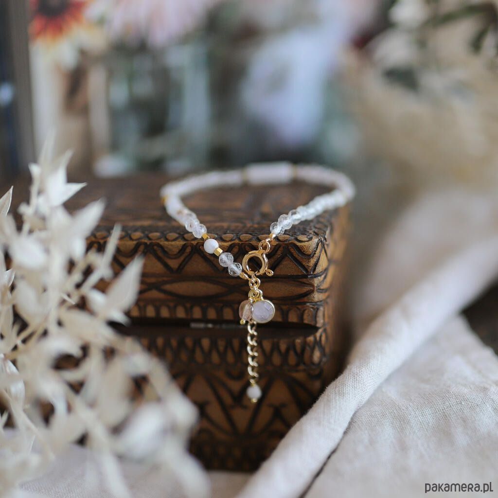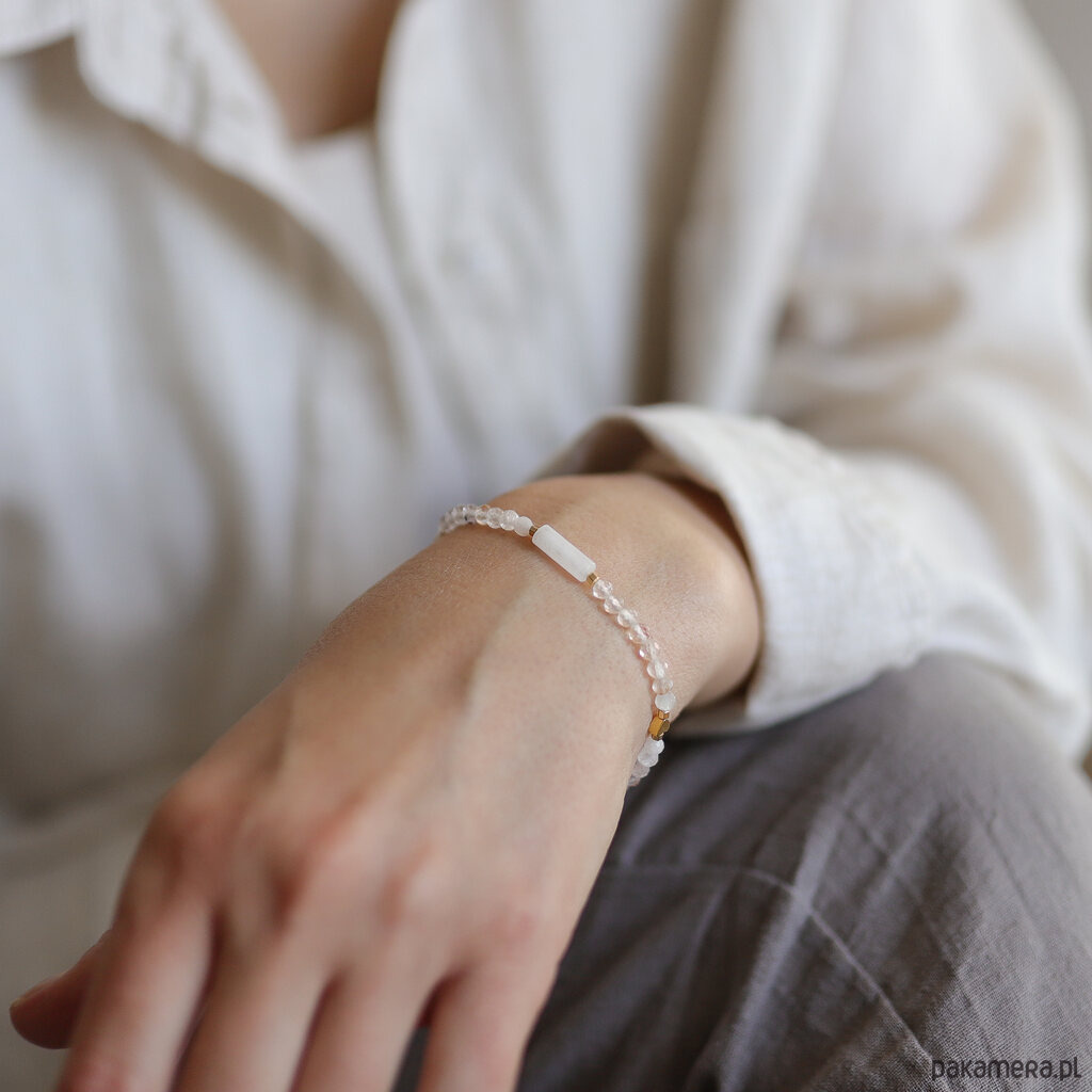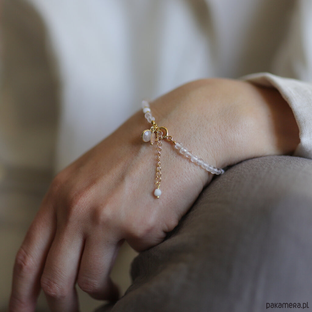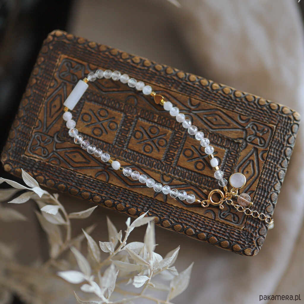 Delikatność kryształu górskiego i połyskująca biel kamienia księżycowego w bransoletce, jest niczym krople rosy tańczące o brzasku. To połączenie naturalnych elementów sprawia, że biżuteria nabiera wyjątkowego charakteru. Staje się symbolem harmonii i piękna, przypominając nam o subtelnych i ulotnych chwilach otaczającego nas świata.