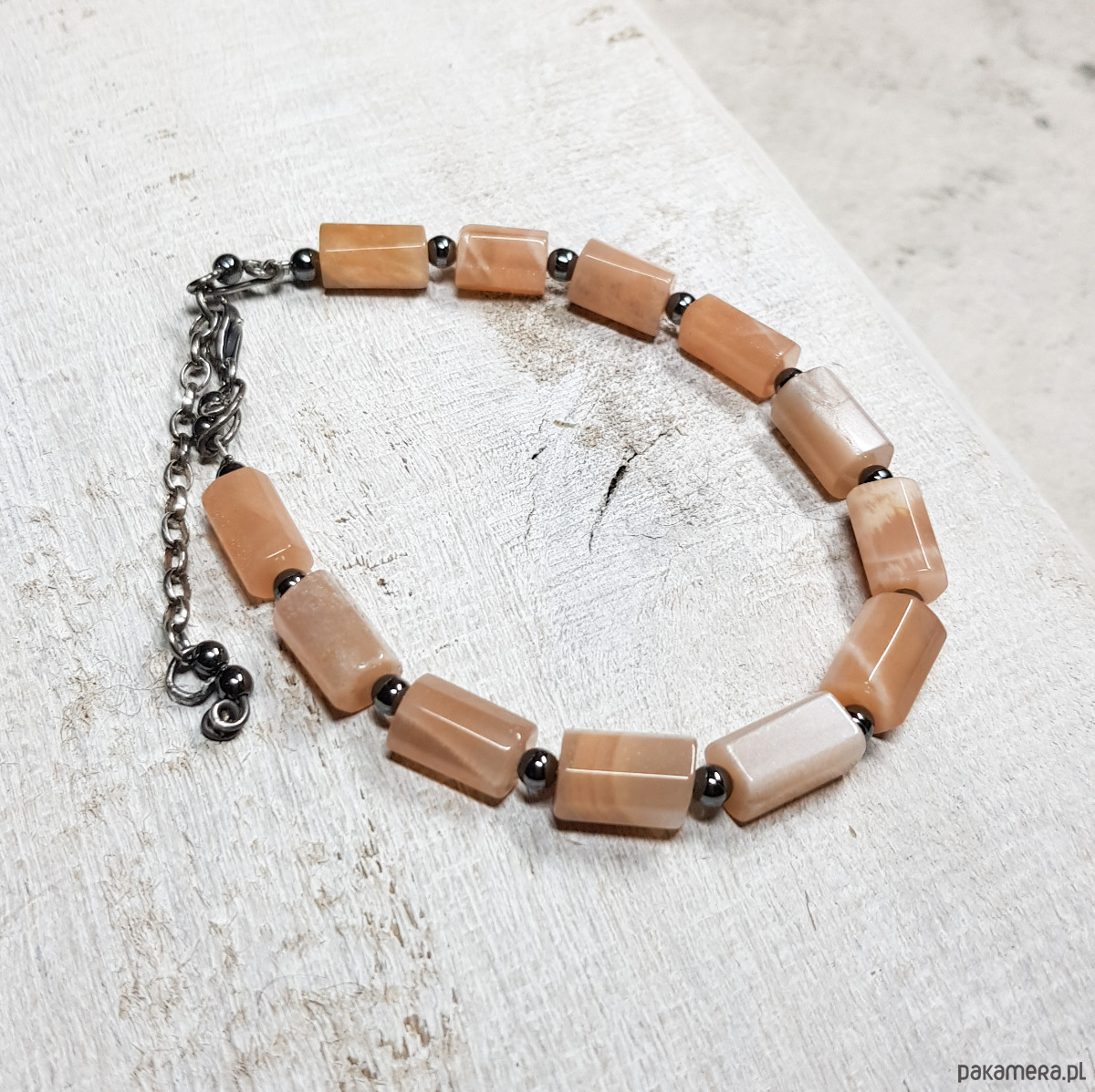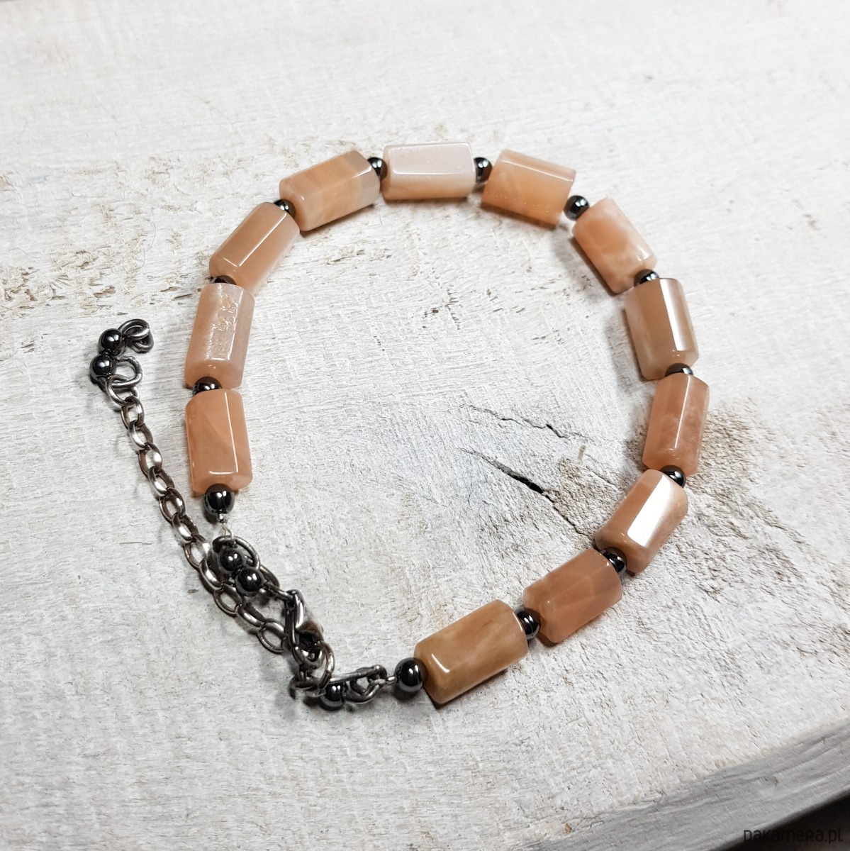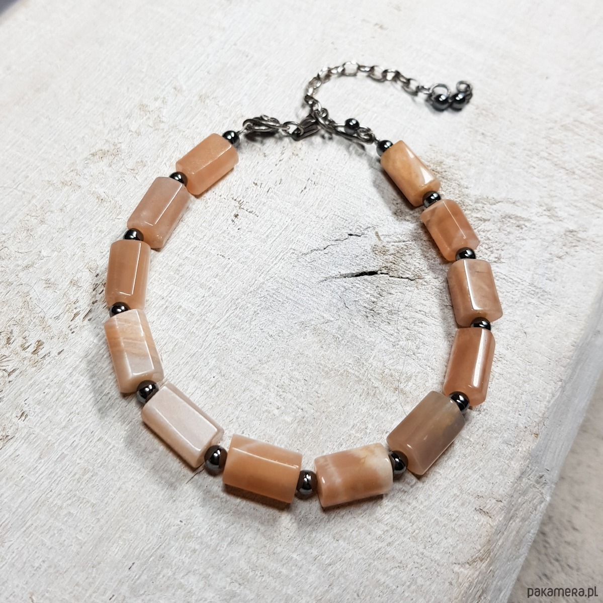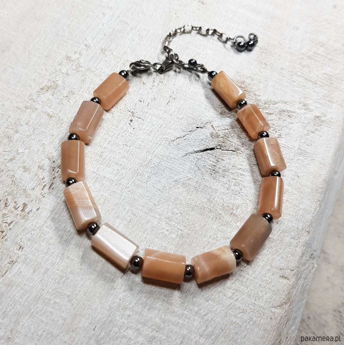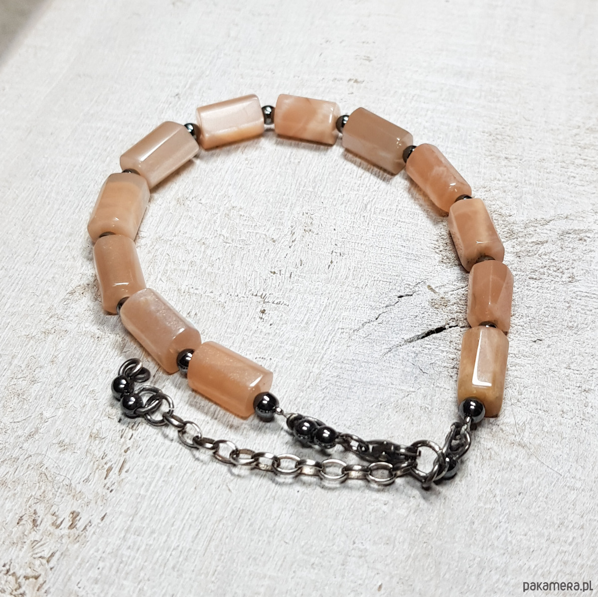 Bransoletka wykonana z naturalnych wałków kamienia słonecznego 11mmx6-7mm o pięknym perłowym połysku. Zapięcie i łańcuszek wykonane w srebrze, które zostało przyczernione oksydą i wypolerowane. Długość bransoletki wynosi ok. 19 cm, plus łańcuszek regulacyjny 3,5 cm.