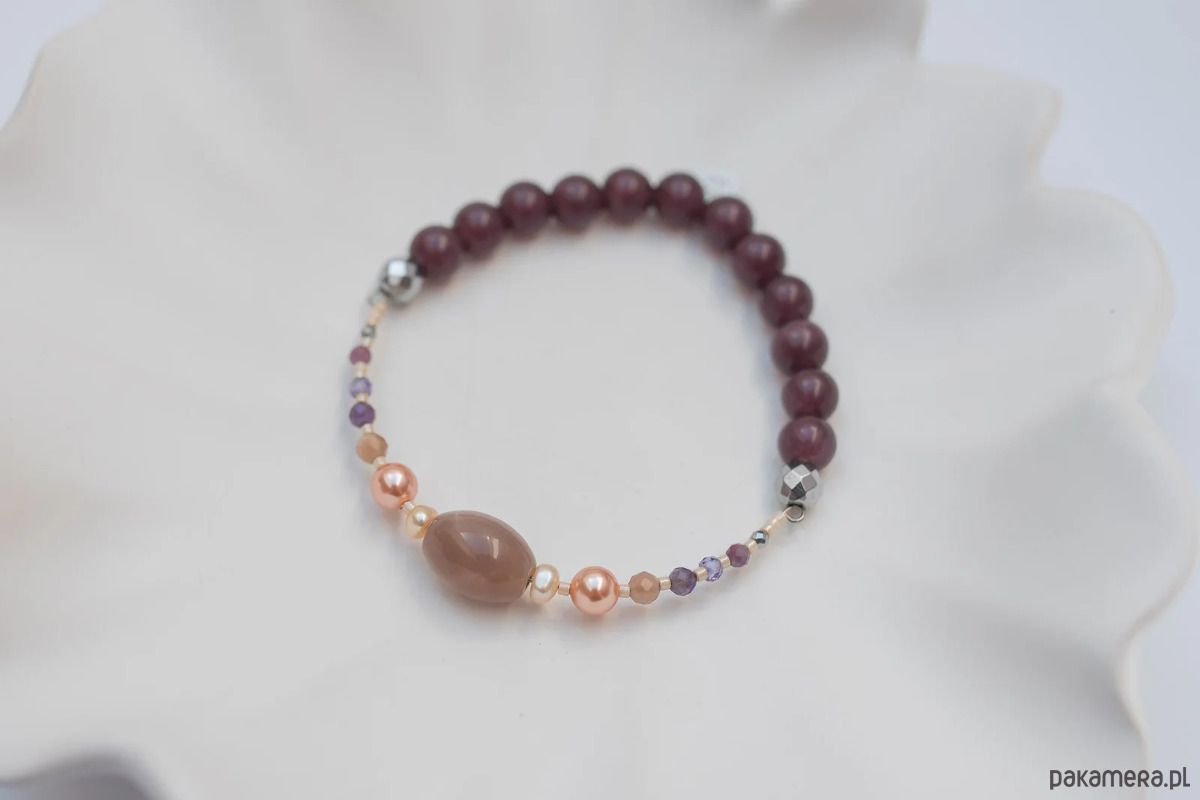 Bransoletka została wykonana przy użyciu dużej oliwki Kamienia Słonecznego, którą połączyliśmy w części sztywnej z drobnymi Perłami, Kamieniem Słonecznym, Ametystem oraz Cyrkonią. W części elastycznej znajdują się gładkie Jaspisy Dalmatyńskie (6 mm), a za wykończenie całości odpowiada matowy Hematyt o srebrnym odcieniu. Wszystkie elementy w biżuterii są 100% antyalergiczne.