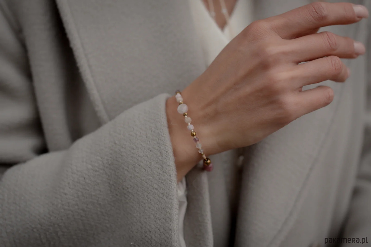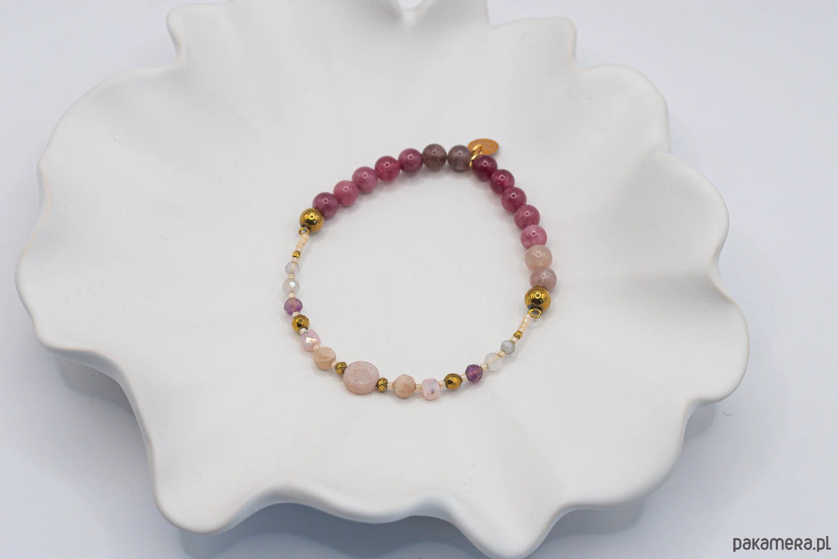 Bransoletka została wykonana przy użyciu okrągłego Kamienia Słonecznego, który połączyliśmy z drobnymi Opalami, Ametystami oraz Topazami w części sztywnej. Natomiast w części elastycznej użyliśmy różowe Turmaliny (6 mm), a za wykończenie kompozycji odpowiada złoty Hematyt. Wszystkie elementy w biżuterii są 100% antyalergiczne.