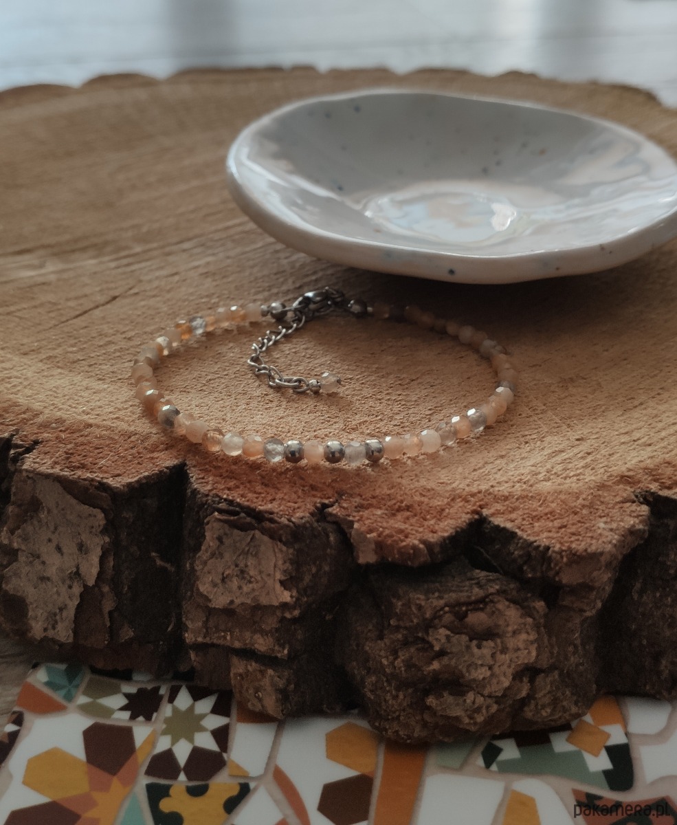 Delikatna bransoletka łącząca pastelowe odcienie szarości i pomarańczu. Tę subtelną mozaikę tworzy cieniowany kamień słoneczny, uzupełniony kuleczkami ze stali szlachetnej. Drobne minerały o fasetowym szlifie pięknie odbijają światło, a wewnątrz kamienia można dostrzec drobinki wywołujące efekt migotania. Ta bransoletka jest przepełniona letnią, słoneczną aurą! Dzięki swojej lekkości i subtelności, będzie pasowała to wielu stylizacji, zachowując wciąż swoją delikatność.