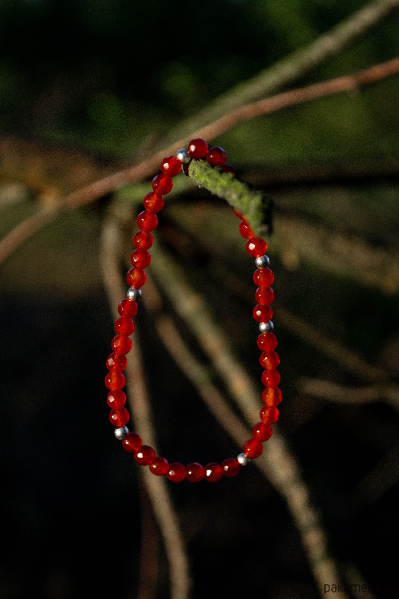 Materiały ~ elastyczna gumka jubilerska, fasetowany karneol, srebrne elementy ze stali szlachetnej.