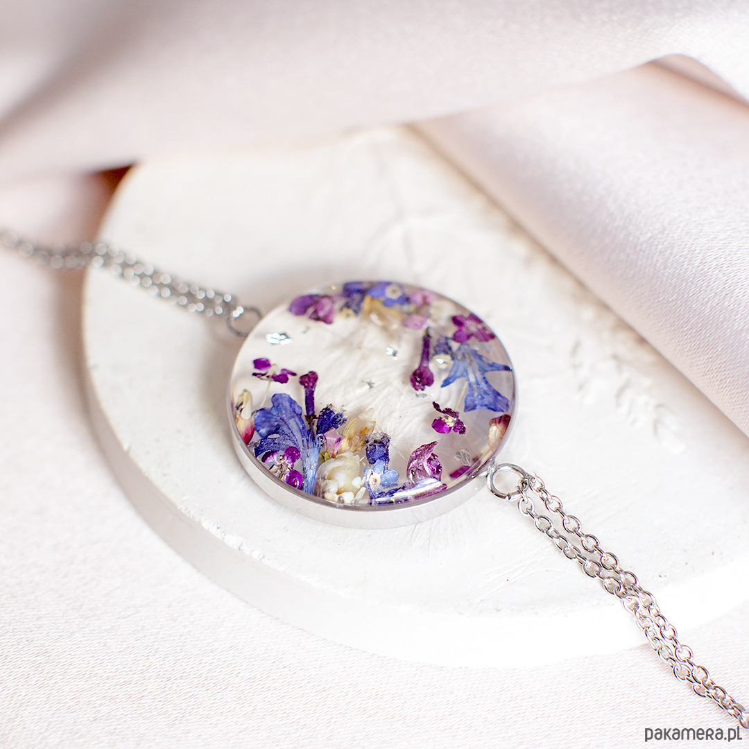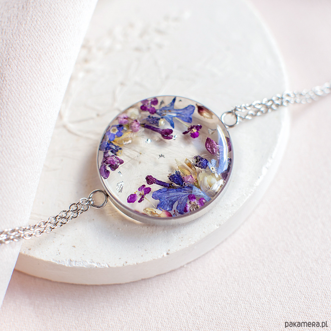 Bransoletka wykonana jest z żywicy epoksydowej z wykorzystaniem suszonych kwiatów. Metalowe elementy to stal nierdzewna szlachetna chirurgiczna