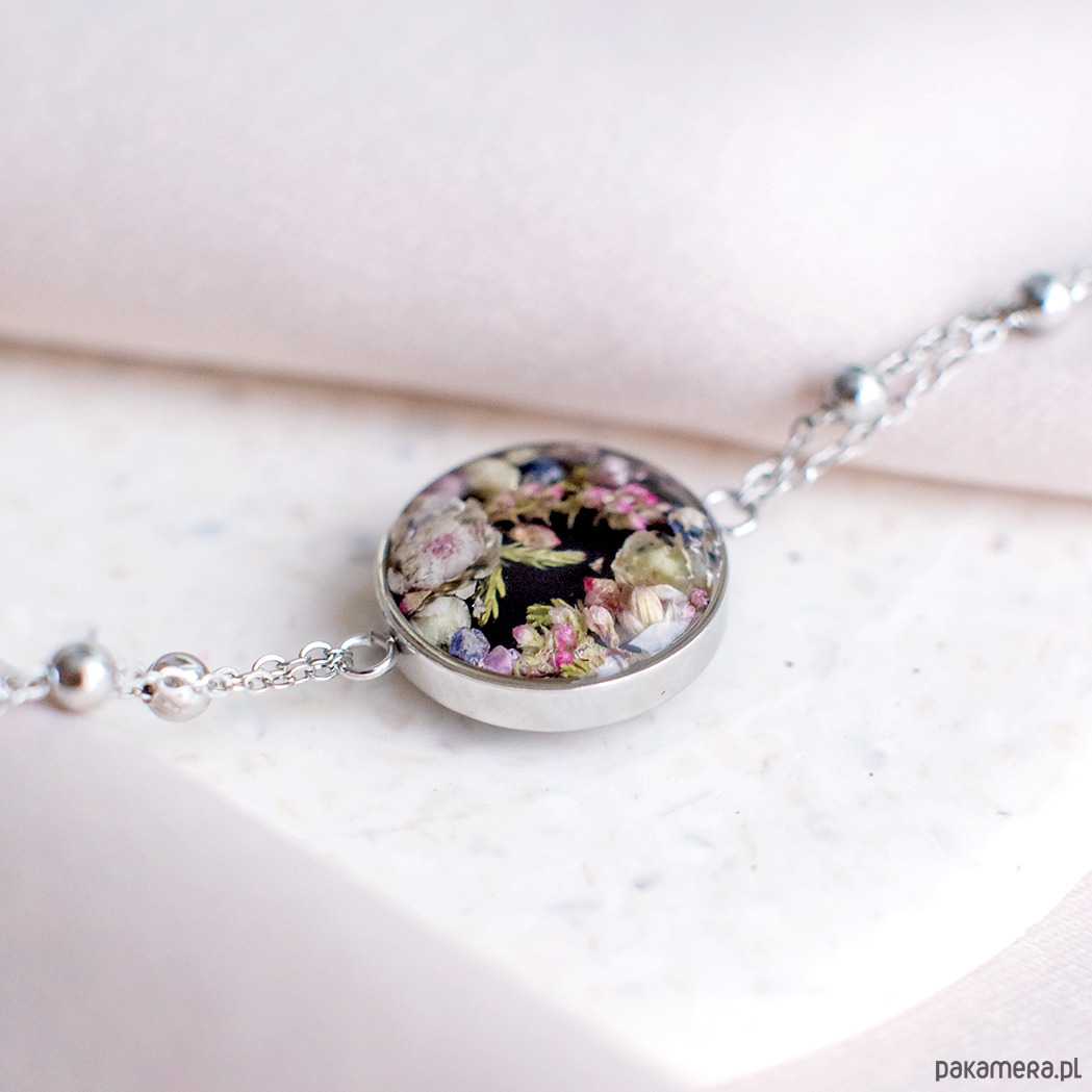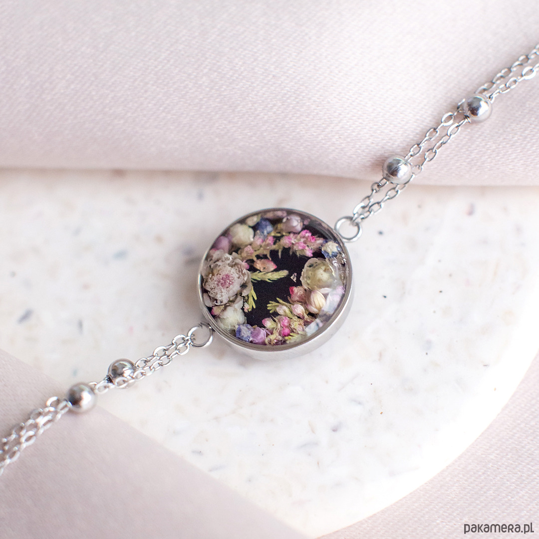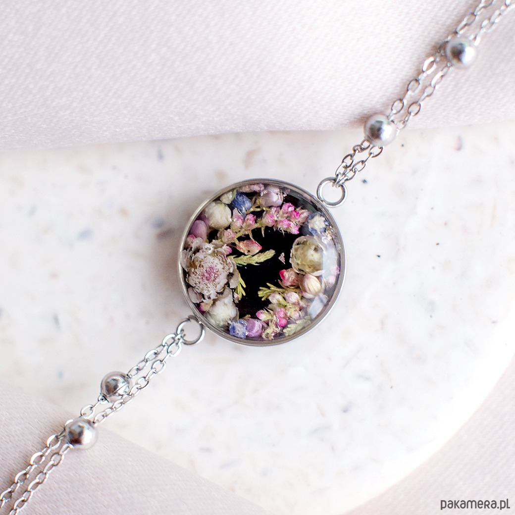 Bransoletka wykonana jest z żywicy epoksydowej z wykorzystaniem suszonych kwiatów. Metalowe elementy to stal nierdzewna szlachetna chirurgiczna