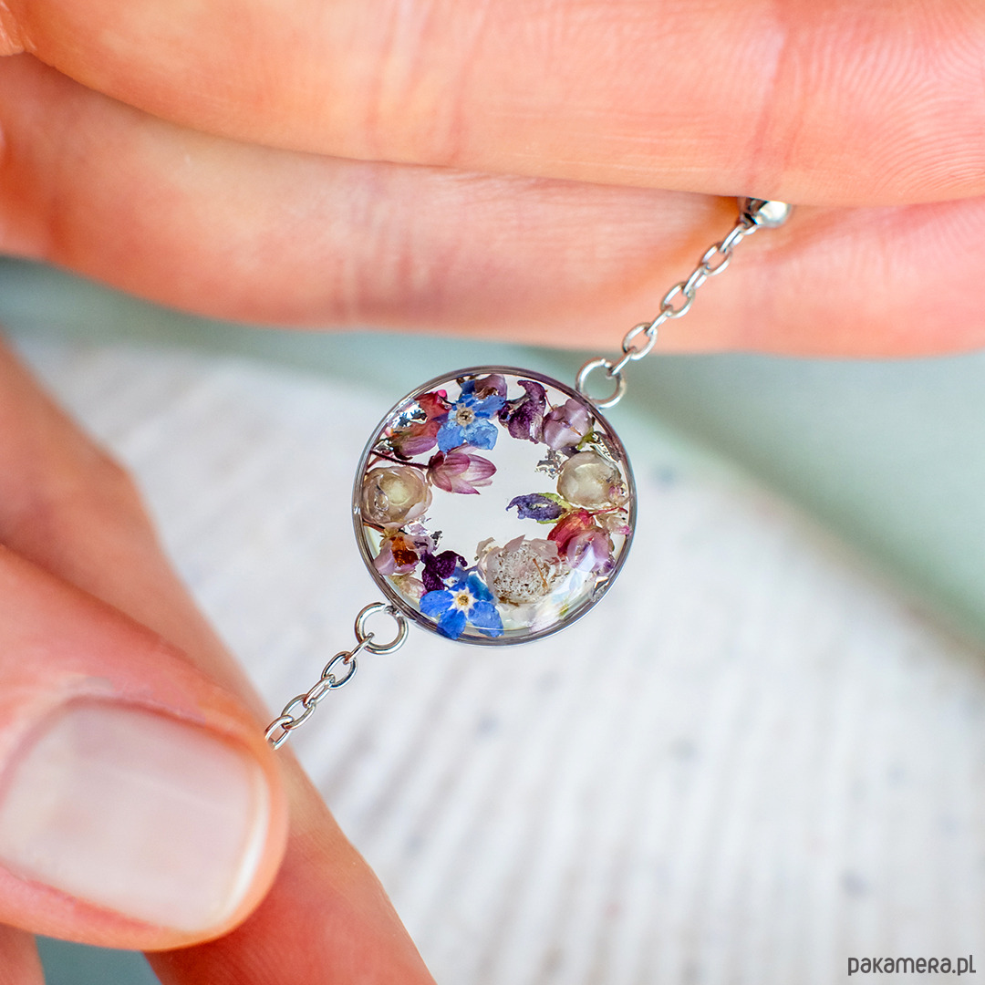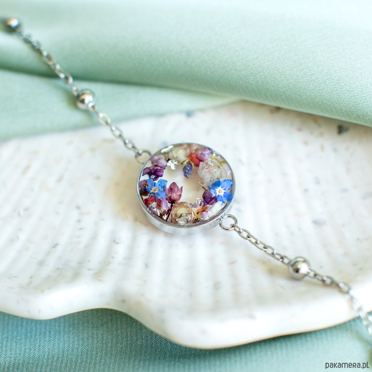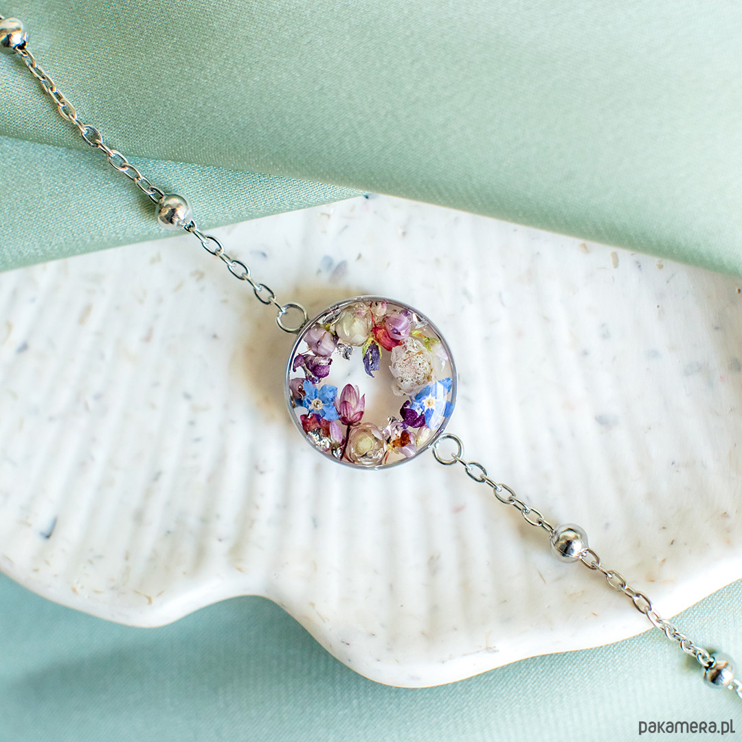 Bransoletka wykonana jest z żywicy epoksydowej z wykorzystaniem suszonych kwiatów. Metalowe elementy to stal nierdzewna szlachetna chirurgiczna