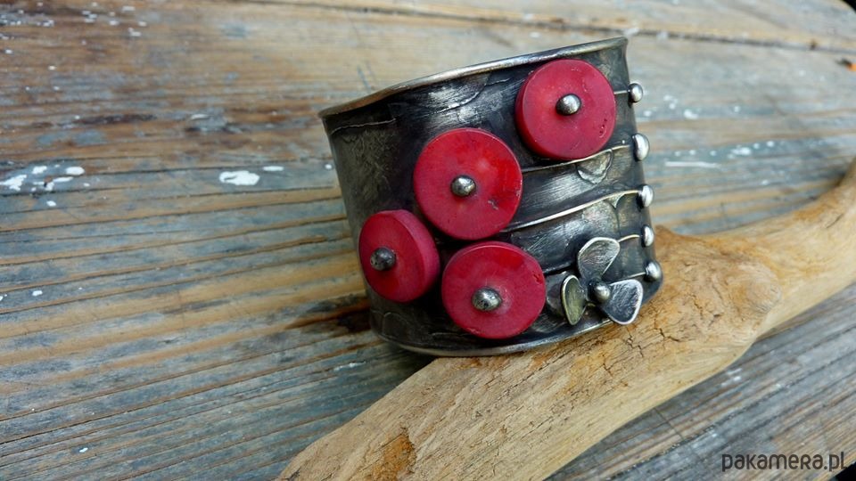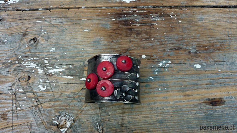 Bransoletka miedziana patynowana z koralem naturalnym .
