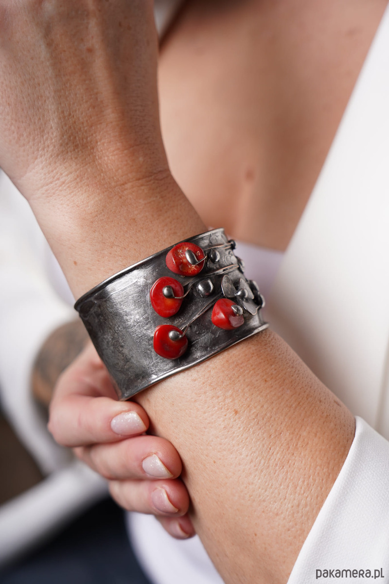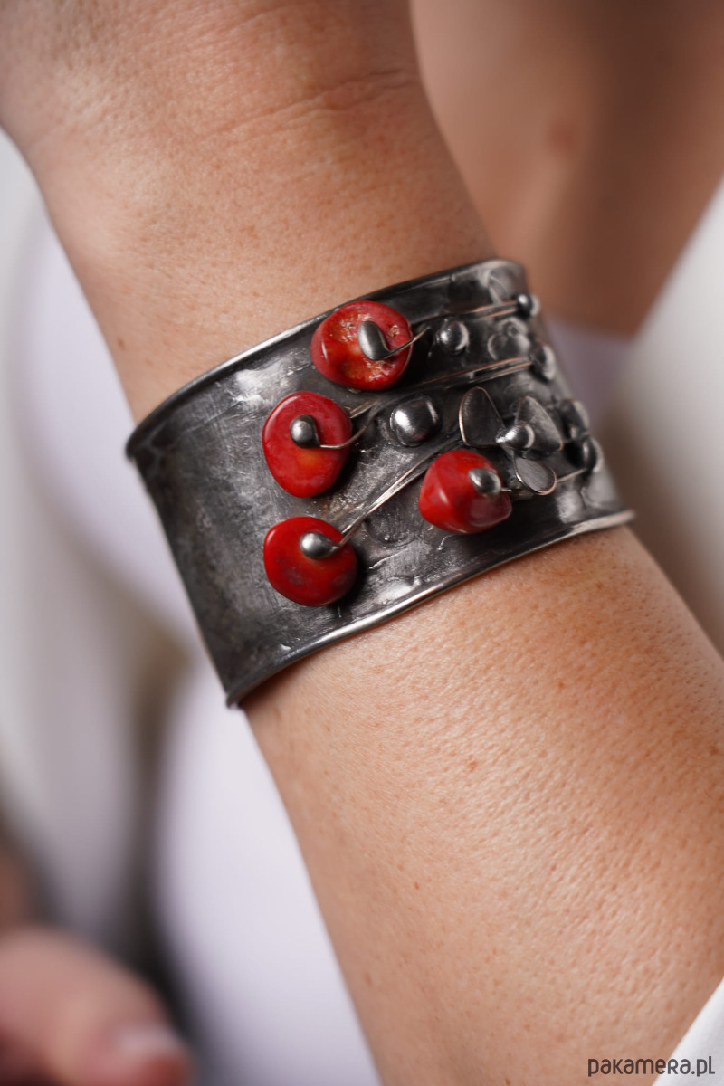 Bransoletka miedziana patynowana z koralem naturalnym .