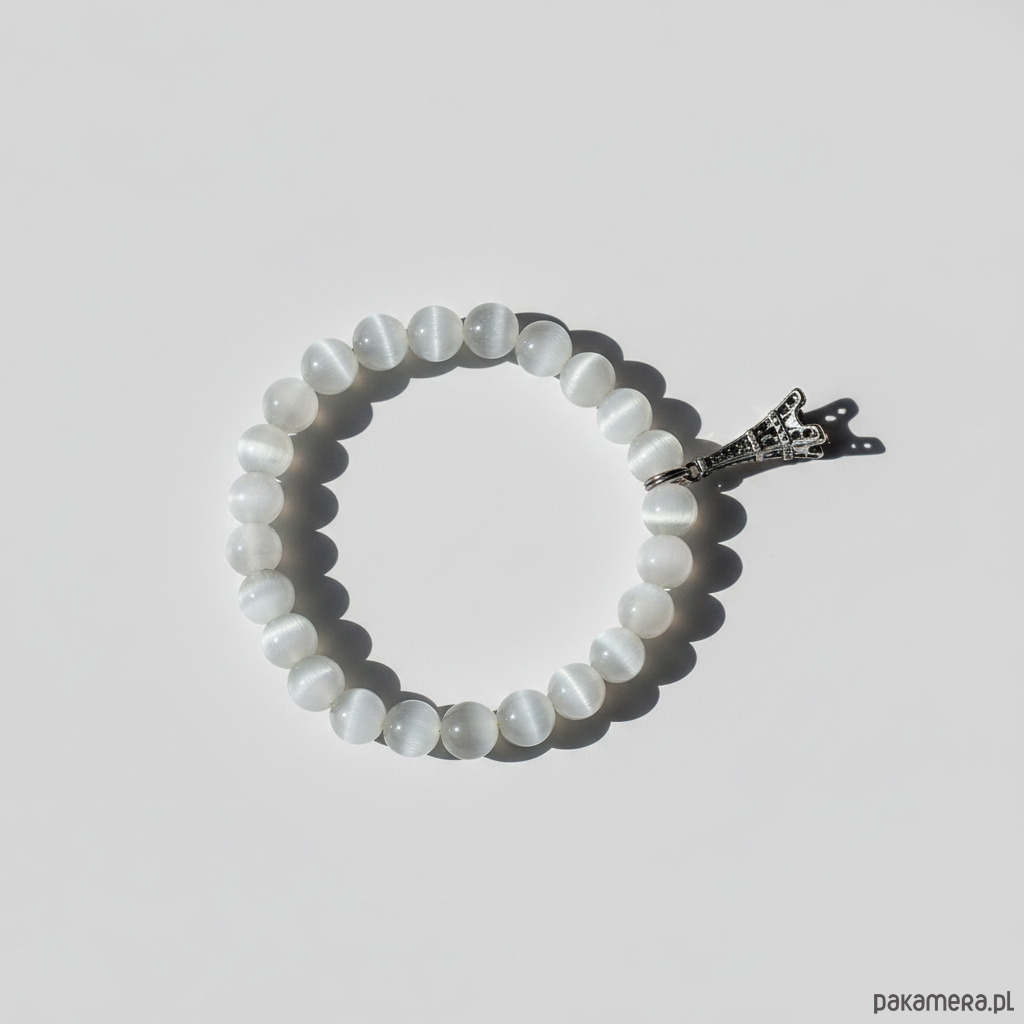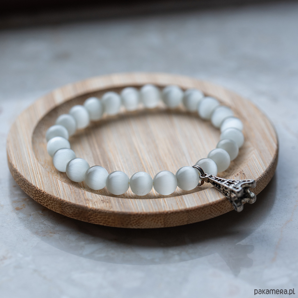 Jej prosty, lecz uroczy design sprawia, że doskonale pasuje do różnych stylizacji, dodając im nuty elegancji i subtelnego uroku. Białe koraliki imitujące kocie oko dodają bransoletce delikatności, podczas gdy metalowa zawieszka w kształcie Wieży Eiffla nadaje jej niepowtarzalnego charakteru.