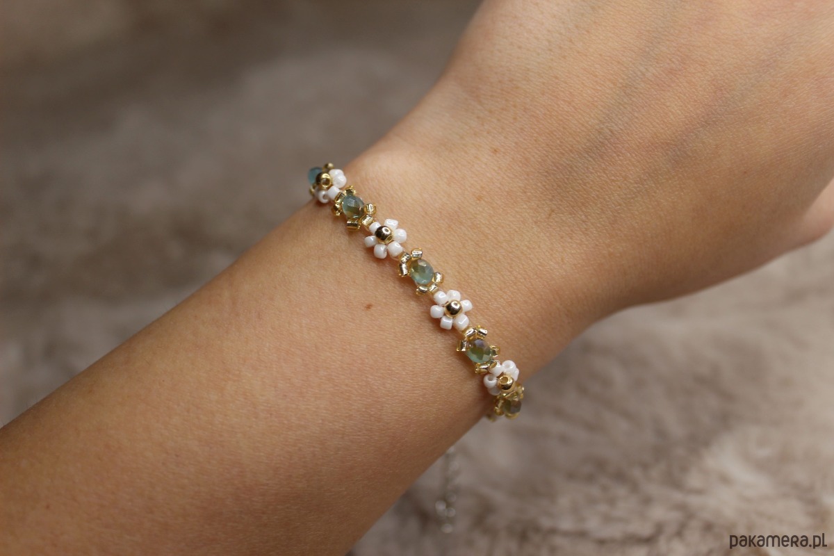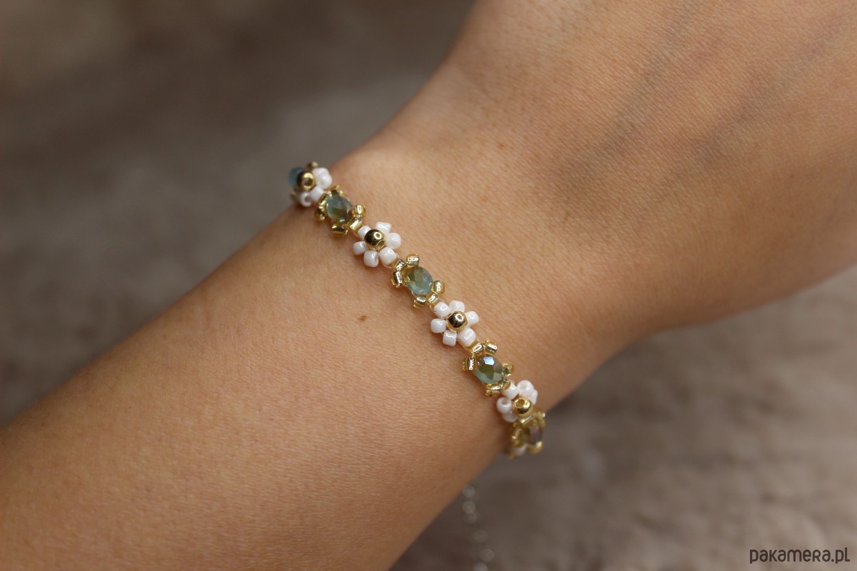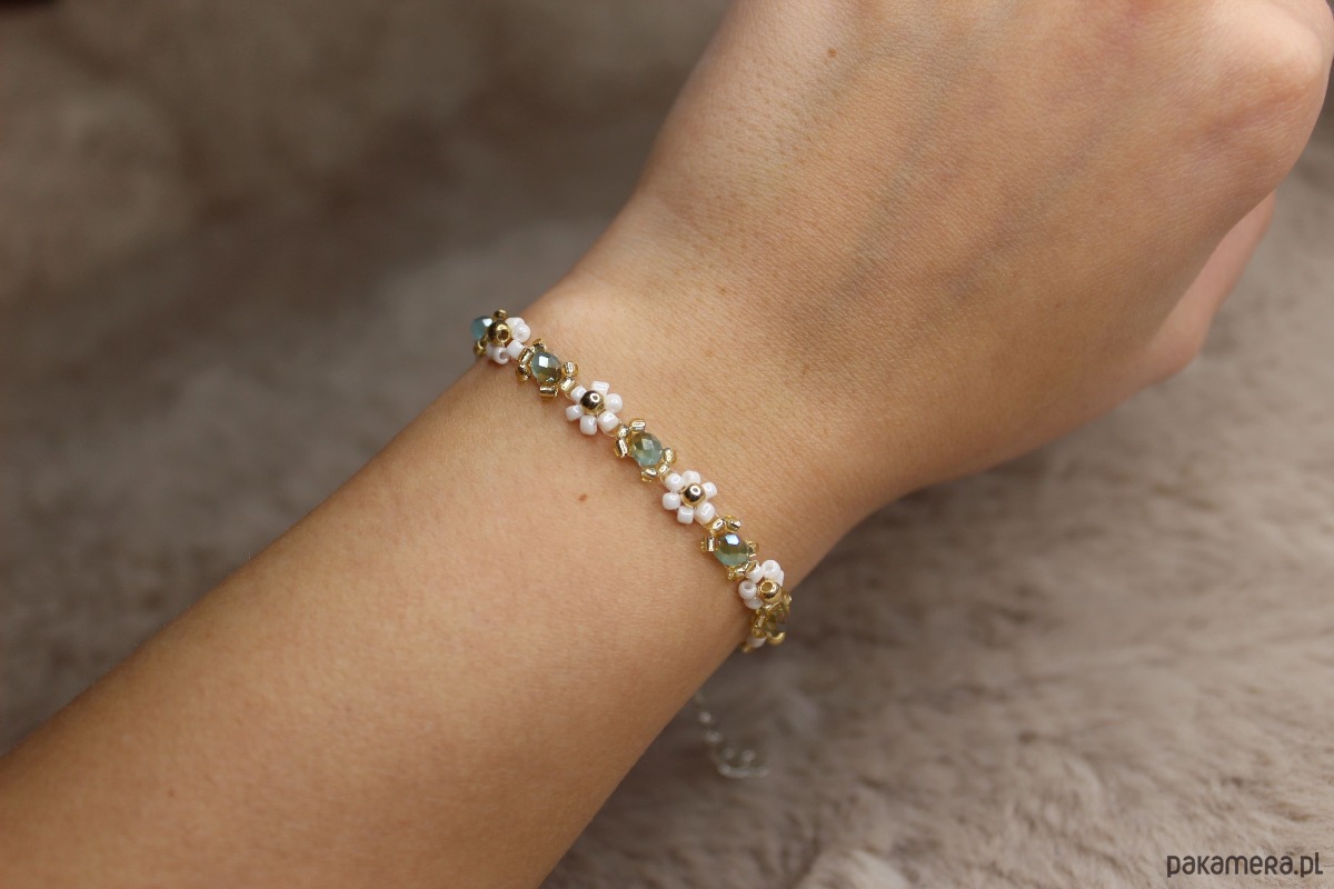 Bransoletka z kwiatowym motywem wykonana ze szklanych koralików.