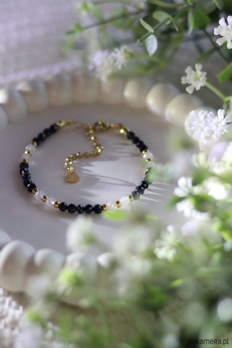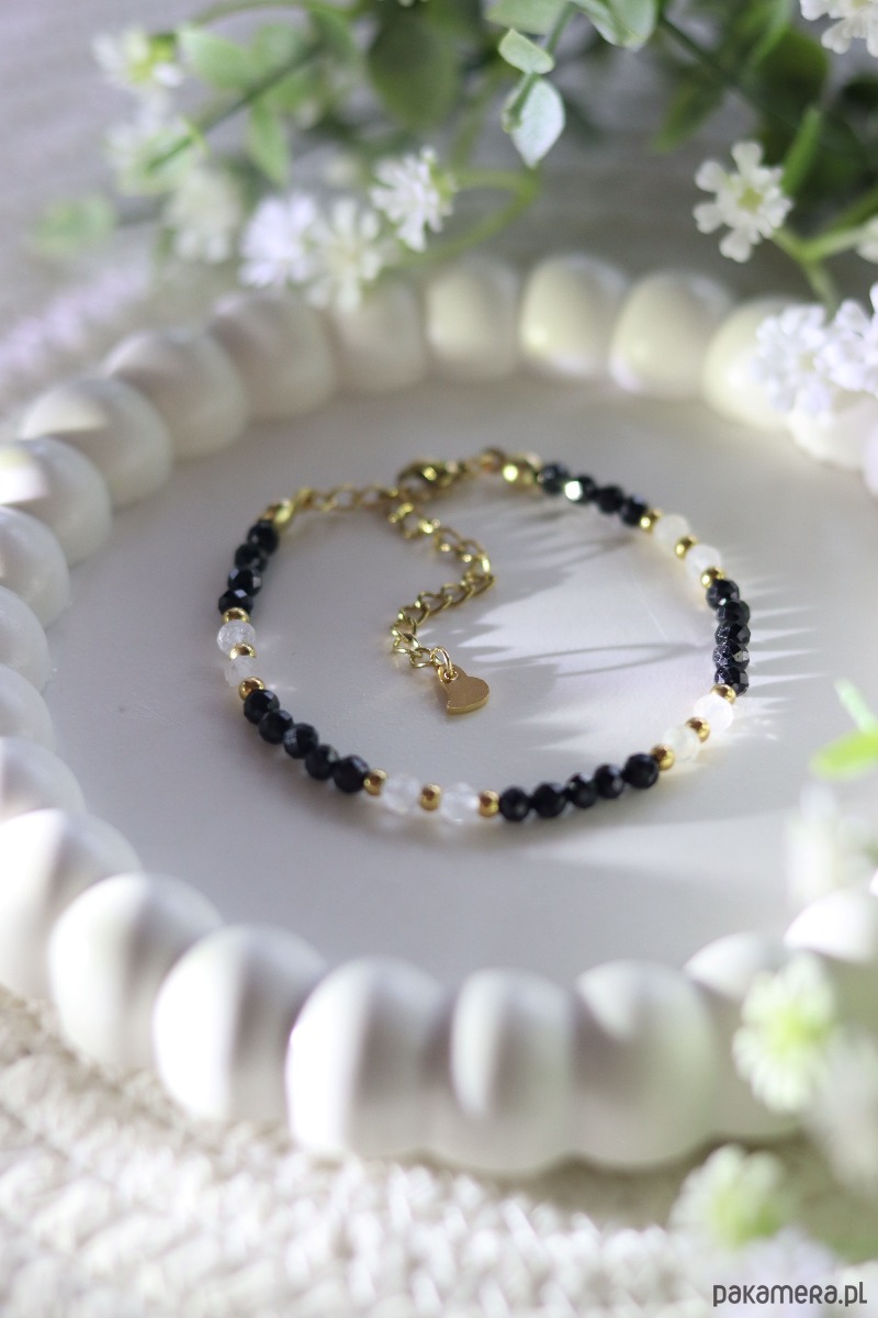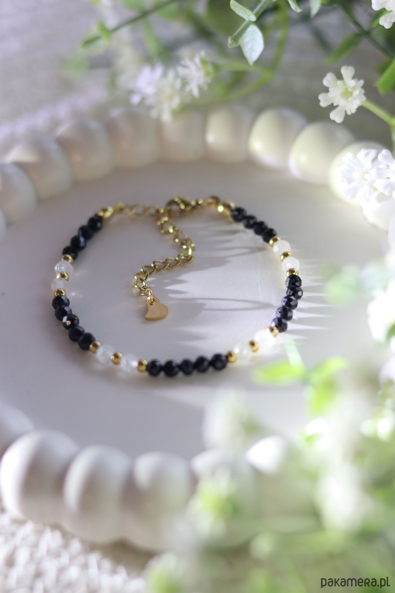 Bransoletka została wykonana z najwyższą starannością, z dbałością o każdy detal. Kamienie są fasetowane, dzięki czemu pięknie odbijają światło i nadają bransoletce delikatny, szlachetny blask. Wszystkie metalowe elementy – w tym zapięcie i przedłużka – wykonane są z pozłacanej stali chirurgicznej nierdzewnej. Długość bransoletki to około 16 cm z możliwością regulacji dzięki 5 cm przedłużce, zakończonej ozdobnym serduszkiem.