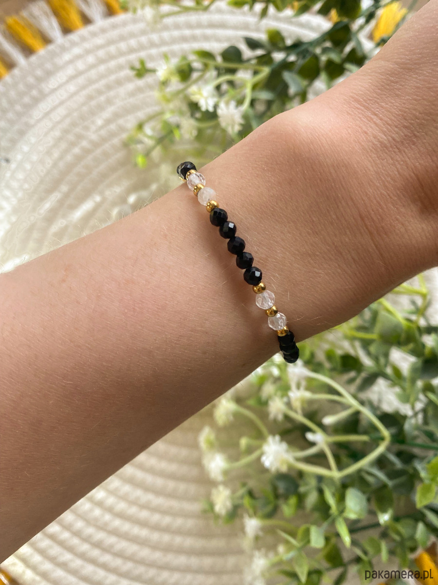 Bransoletka kryształ górski z turmalinem to ręcznie wykonana biżuteria z fasetowanych kamieni naturalnych, łącząca elegancję z głęboką symboliką i energetycznym działaniem. Kryształ górski, znany jako "kamień mocy", oczyszcza, wspiera koncentrację i równowagę, a przede wszystkim wzmacnia działanie innych kamieni, dzięki czemu idealnie współgra z turmalinem. Turmalin to kamień ochrony – neutralizuje negatywne energie, wspomaga uziemienie, stabilizuje emocje i poprawia samopoczucie. Wspólnie tworzą silne połączenie wspierające harmonię wewnętrzną, spokój oraz bezpieczeństwo energetyczne.