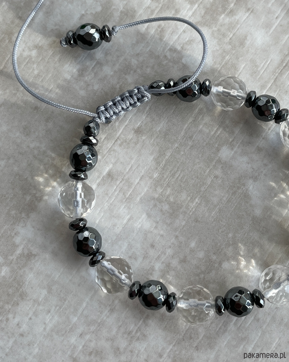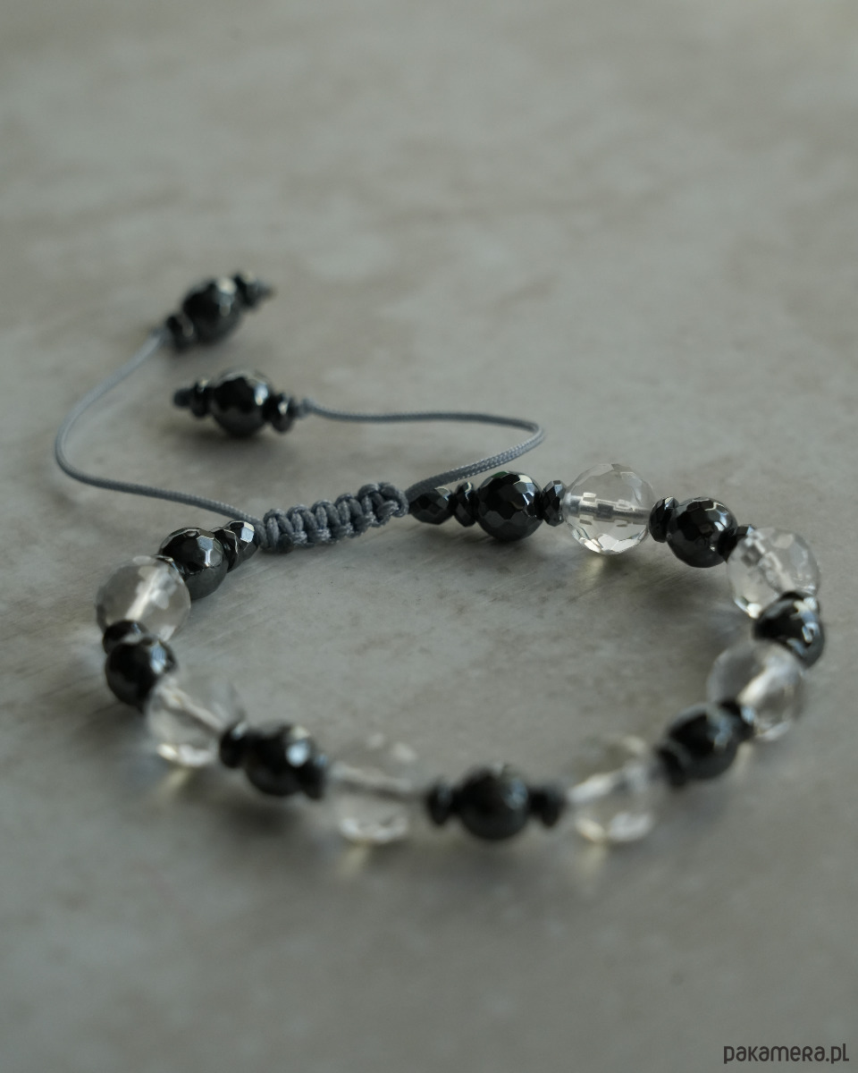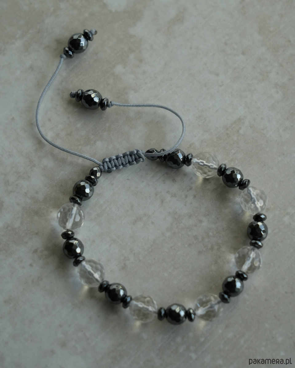 Bransoletka z kryształem górskim i grafitowym hematytem na szarym sznureczku. Bransoletka jest regulowana, dzięki czemu ma uniwersalny rozmiar. Będzie się super prezentować w połączeniu z innymi bransoletkami, nie tylko z minerałów, ale również z czystego srebra i srebra oksydowanego.