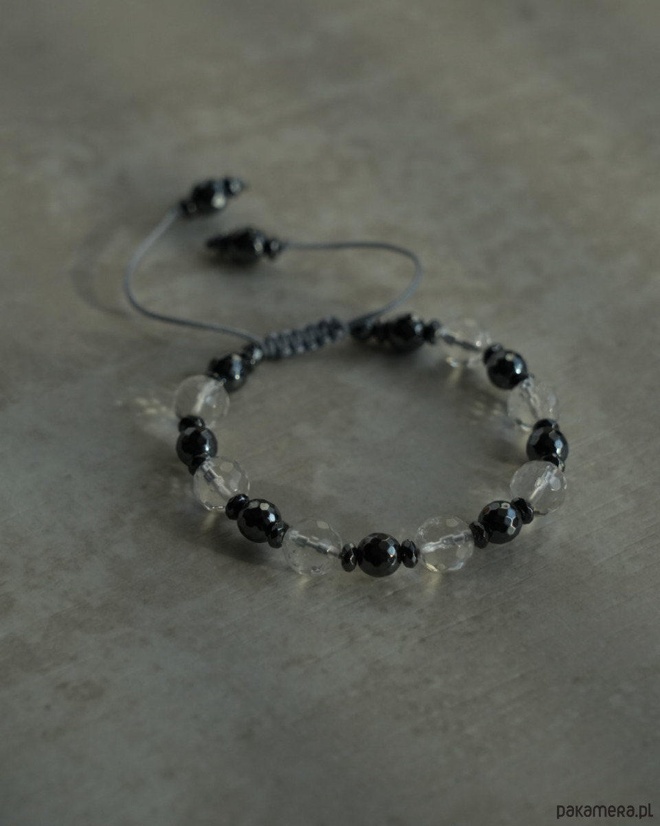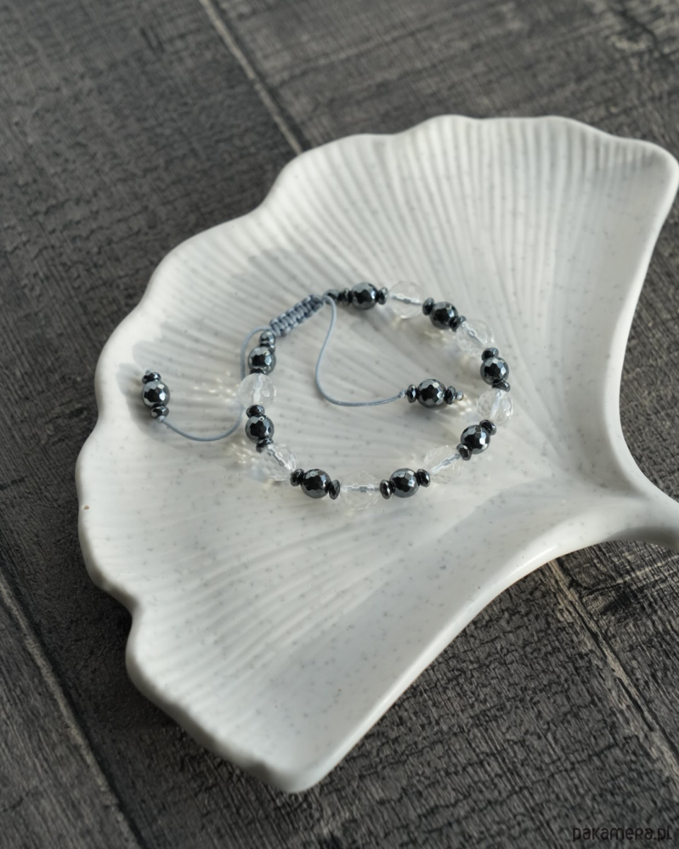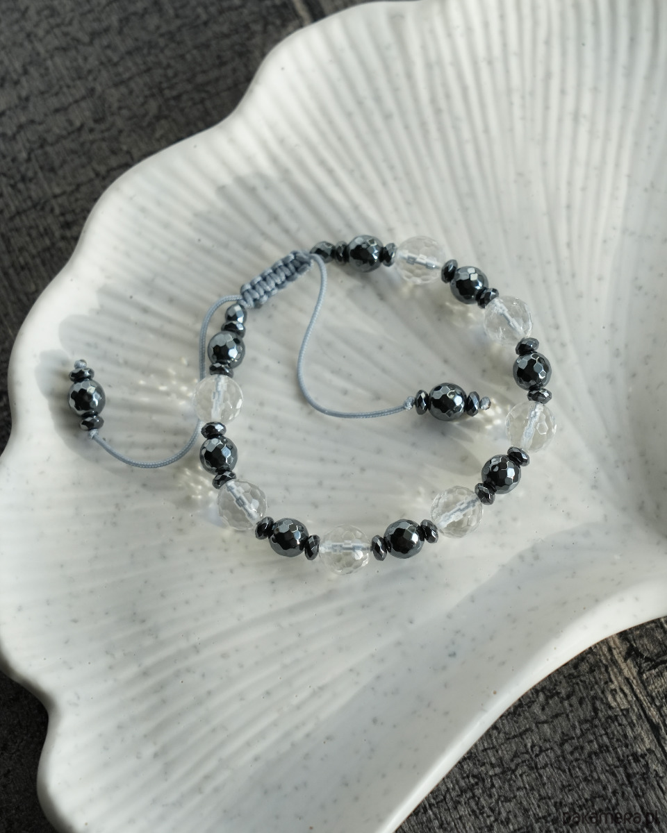 Bransoletka z kryształem górskim i grafitowym hematytem na szarym sznureczku. Bransoletka jest regulowana, dzięki czemu ma uniwersalny rozmiar. Będzie się super prezentować w połączeniu z innymi bransoletkami, nie tylko z minerałów, ale również z czystego srebra i srebra oksydowanego.