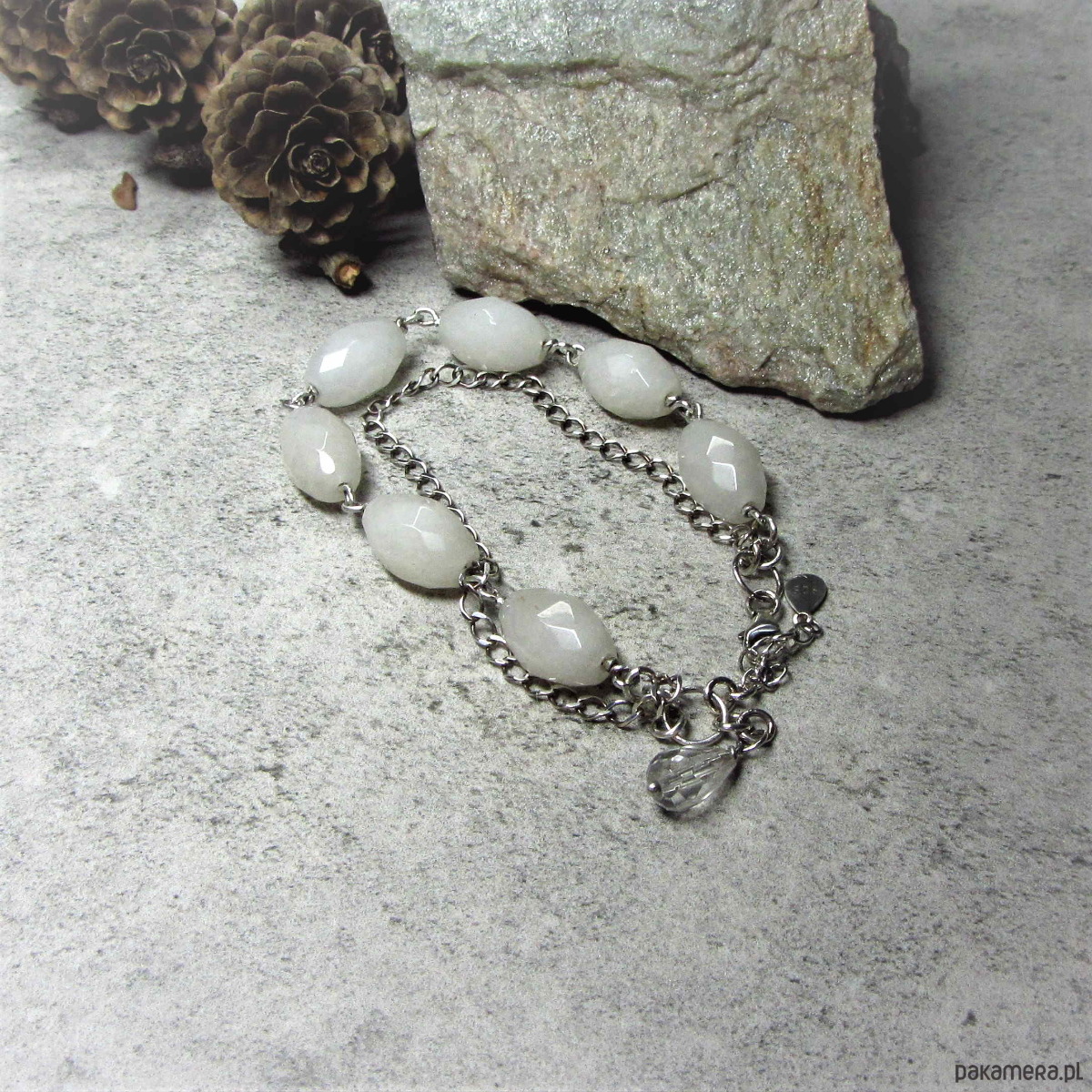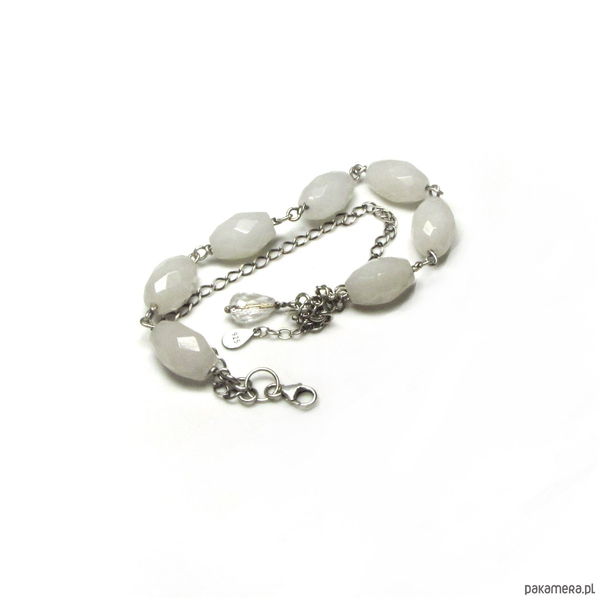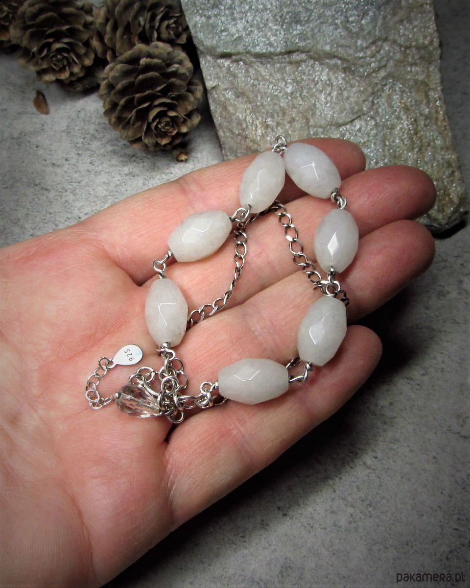 Bransoletka wykonana w srebrze z kryształów górskich oliwek fasetowanych białych 16x10mm. Bransoletka oksydowana i przetarta. Całkowita długość bransoletki około 18,5cm plus 3,5cm