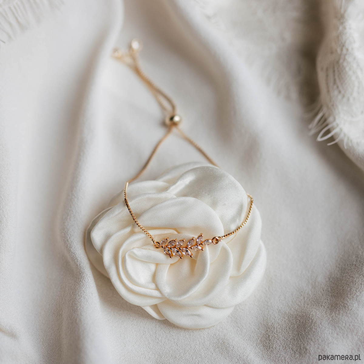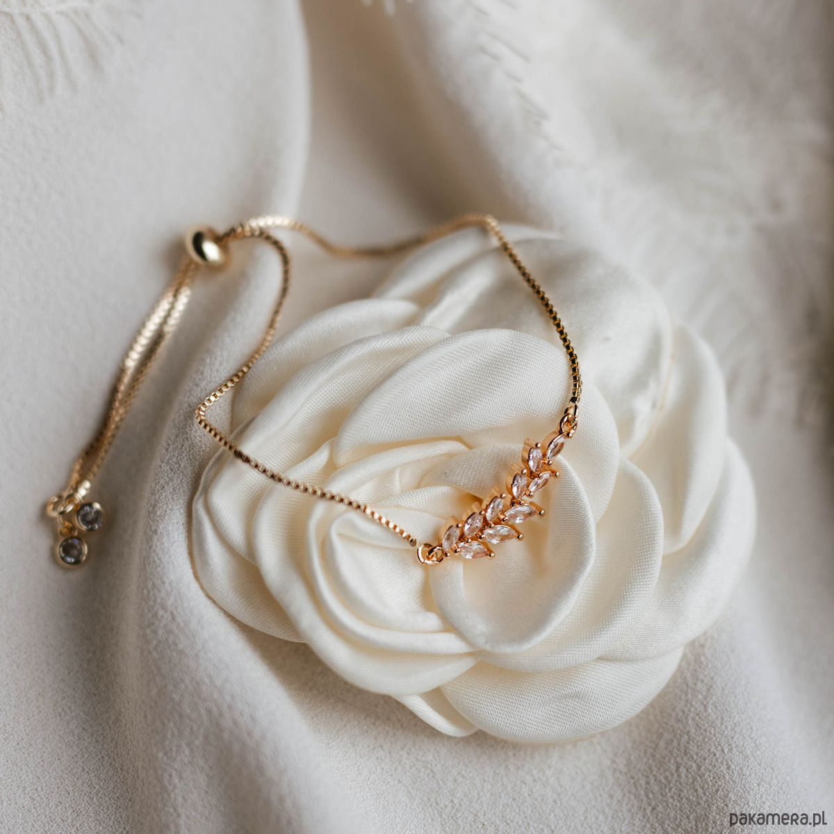 Delikatna i ponadczasowa bransoletka na złotym łańcuszku wykonanym ze stali nierdzewnej, wykończona subtelną, połyskującą kryształową zawieszką. Złote elementy ze stali są trwałe, odporne na matowienie i długo zachowują swój blask.