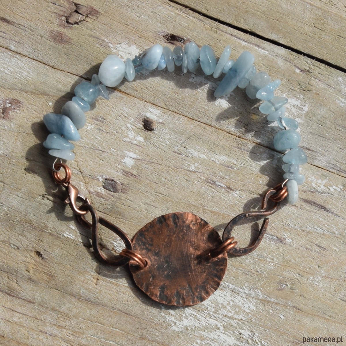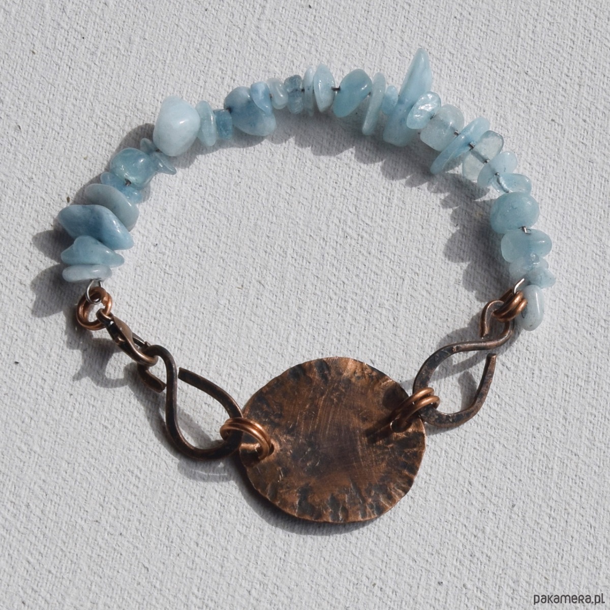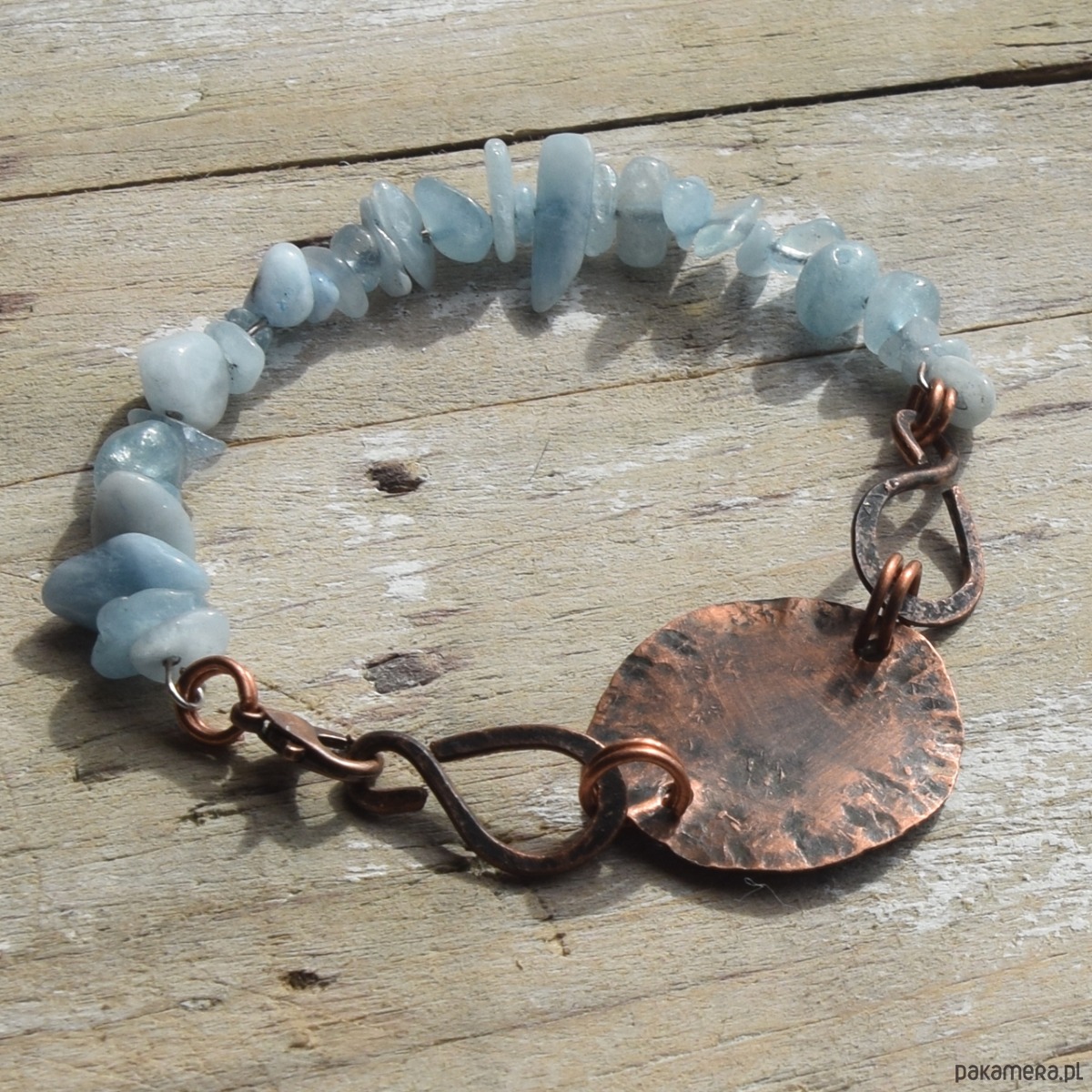 Bransoletka wykonana z kutej, oksydowanej miedzi, częściowo przecieranej papierem ściernym, o surowym charakterze stylizowanym na stary, "wykopaliskowy" metal. Tu połączona z akwamarynem.