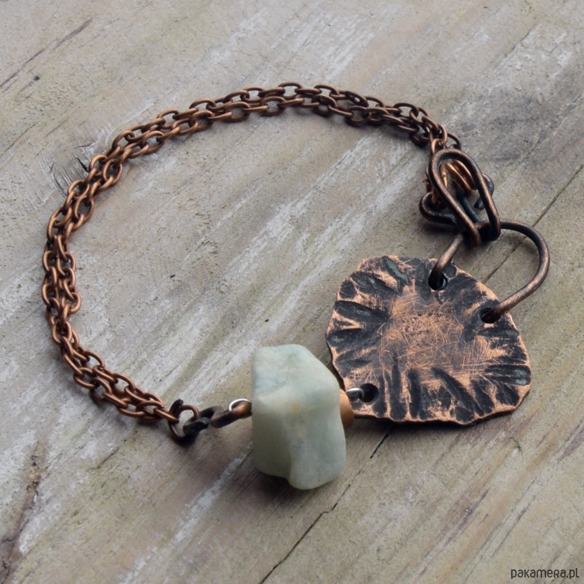 Bransoletka wykonana z kutej, oksydowanej miedzi, częściowo przecieranej dla efektu starego, "wykopaliskowego" metalu, amazonitu oraz łańcuszka w kolorze starej miedzi.