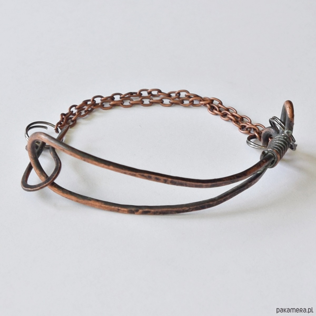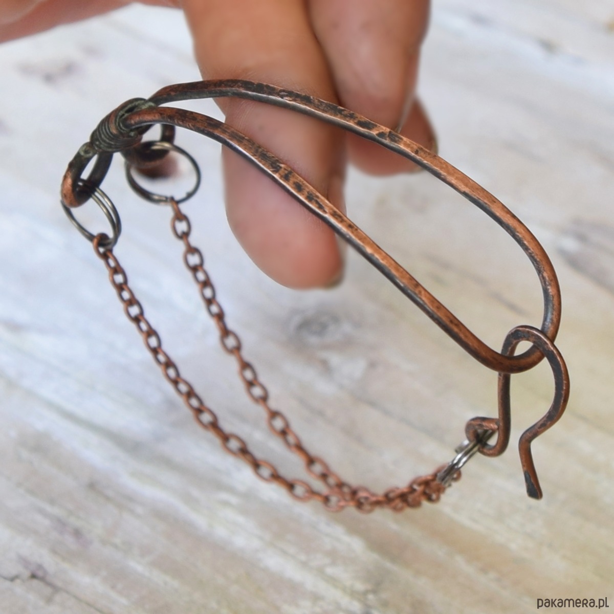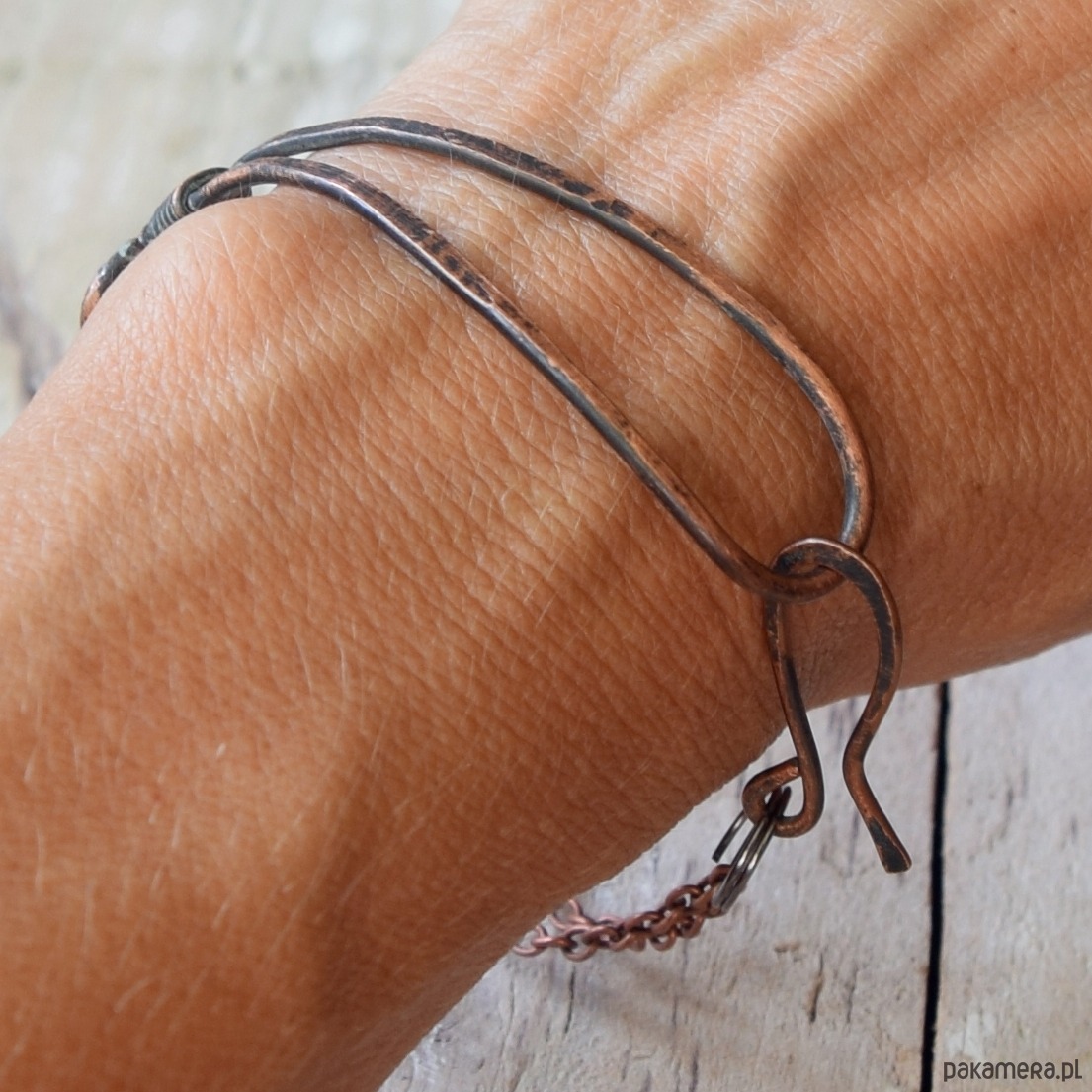 Minimalistyczna bransoletka wykonana z kutej, oksydowanej miedzi, częściowo przecieranej papierem ściernym, o surowym charakterze stylizowanym na stary, "wykopaliskowy" metal. Tu połączona z łańcuszkiem w kolorze starej miedzi.