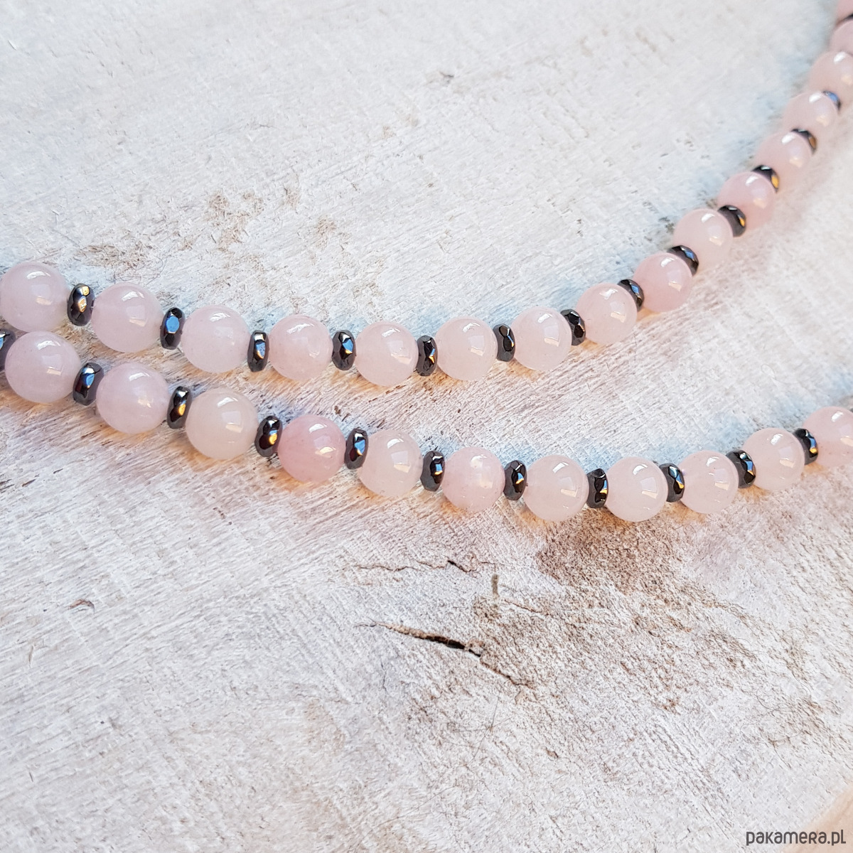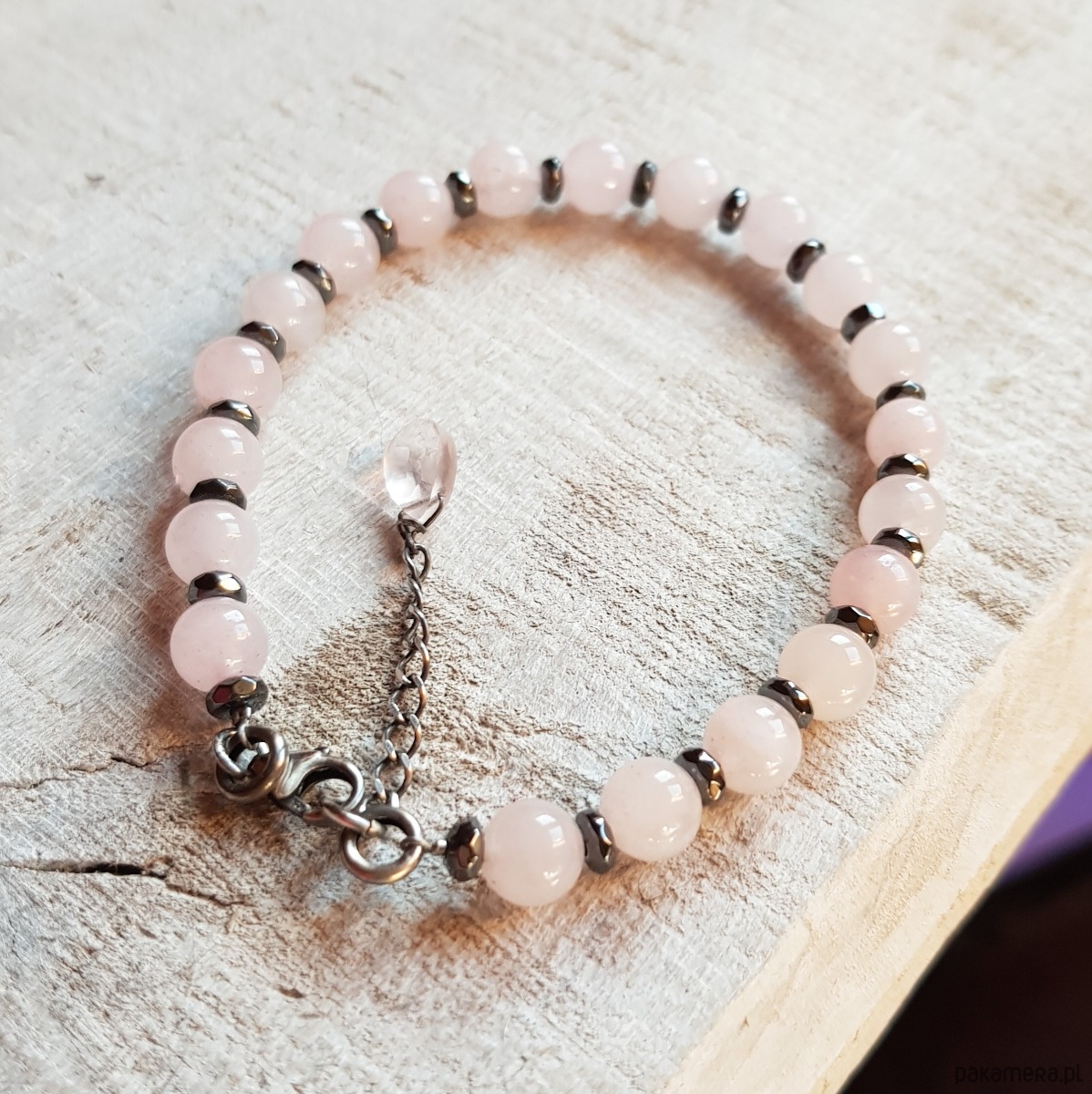 Bransoletka wykonana z wysokiej jakości kamieni kwarcu różowego 6mm, oraz przekładek hematytu. Kamienie kwarcu o kształcie gładkiej kulki 6mm. Wykończenia i zapięcie wykonane w srebrze 925, oksydowanym i wypolerowanym. Długość bransoletki wynosi ok. 18,5 cm plus przedłużka 3,5cm.