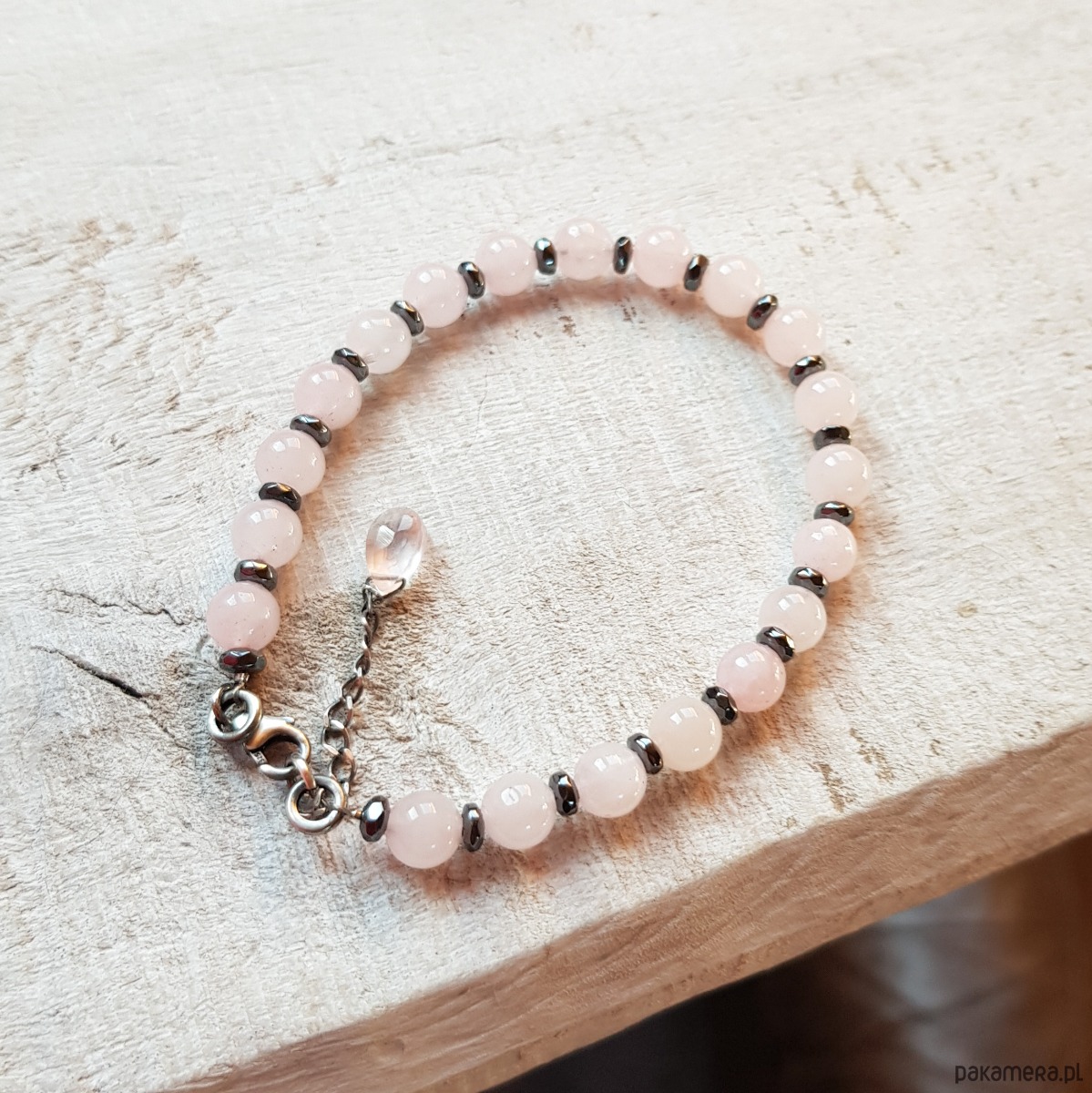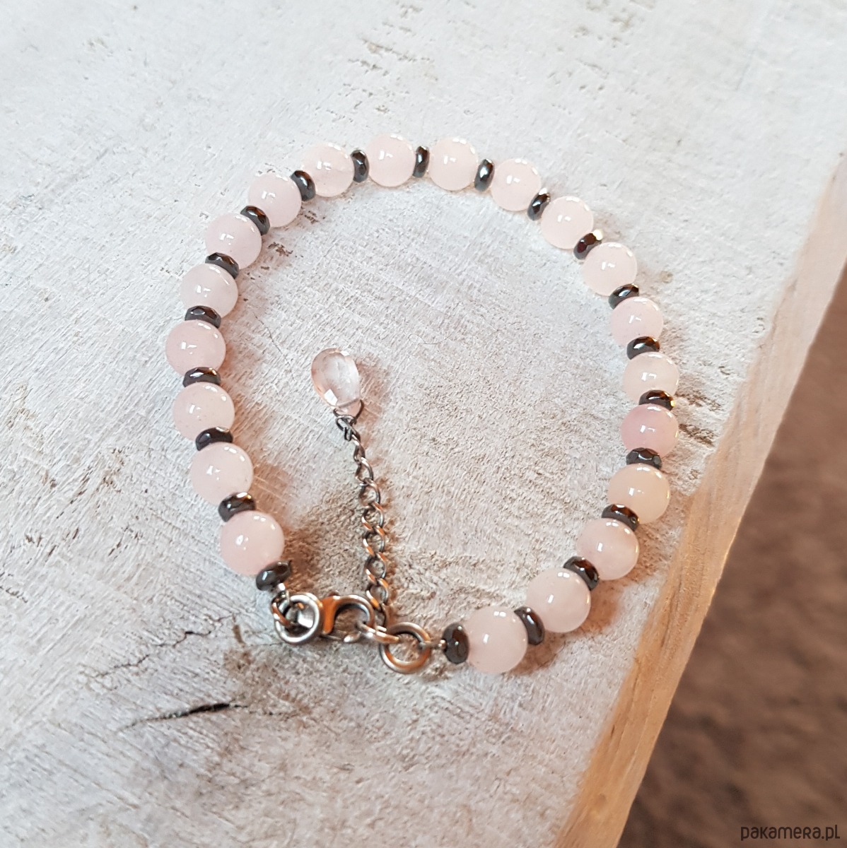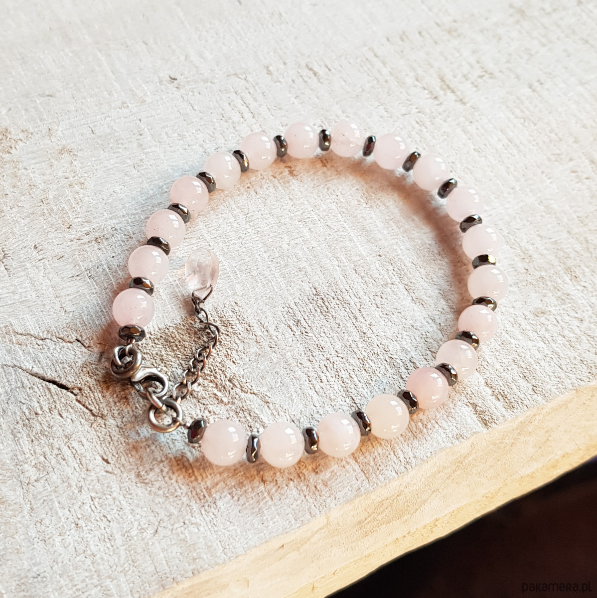 Bransoletka wykonana z wysokiej jakości kamieni kwarcu różowego 6mm, oraz przekładek hematytu. Kamienie kwarcu o kształcie gładkiej kulki 6mm. Wykończenia i zapięcie wykonane w srebrze 925, oksydowanym i wypolerowanym. Długość bransoletki wynosi ok. 18,5 cm plus przedłużka 3,5cm.