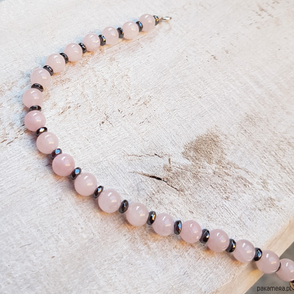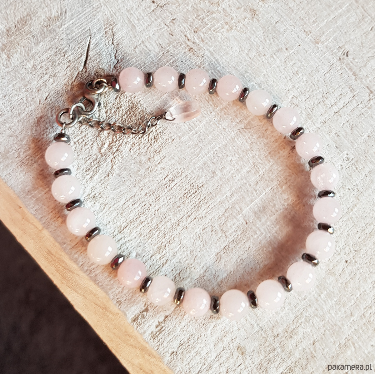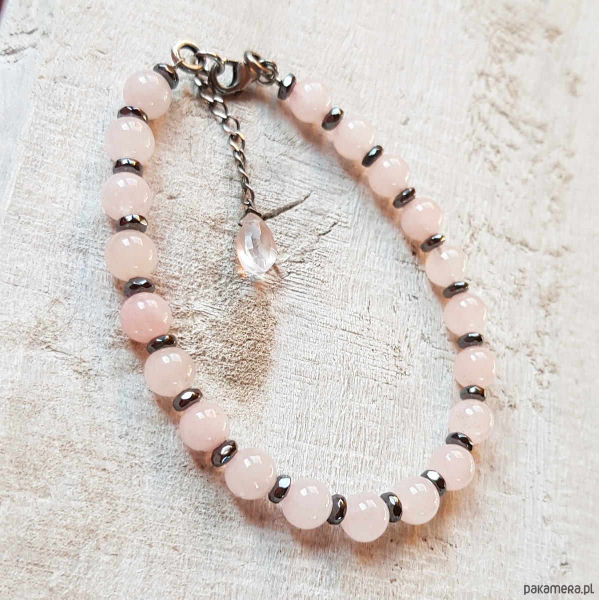 Bransoletka wykonana z wysokiej jakości kamieni kwarcu różowego 6mm, oraz przekładek hematytu. Kamienie kwarcu o kształcie gładkiej kulki 6mm. Wykończenia i zapięcie wykonane w srebrze 925, oksydowanym i wypolerowanym. Długość bransoletki wynosi ok. 18,5 cm plus przedłużka 3,5cm.