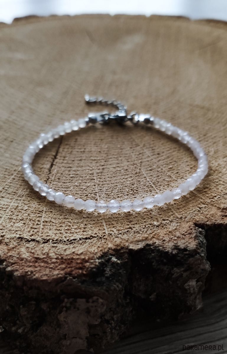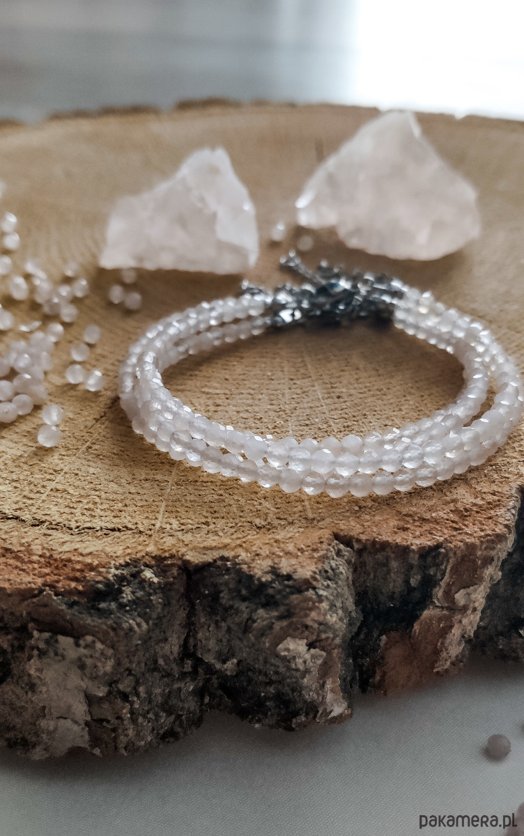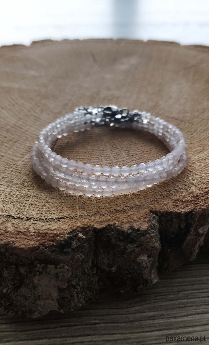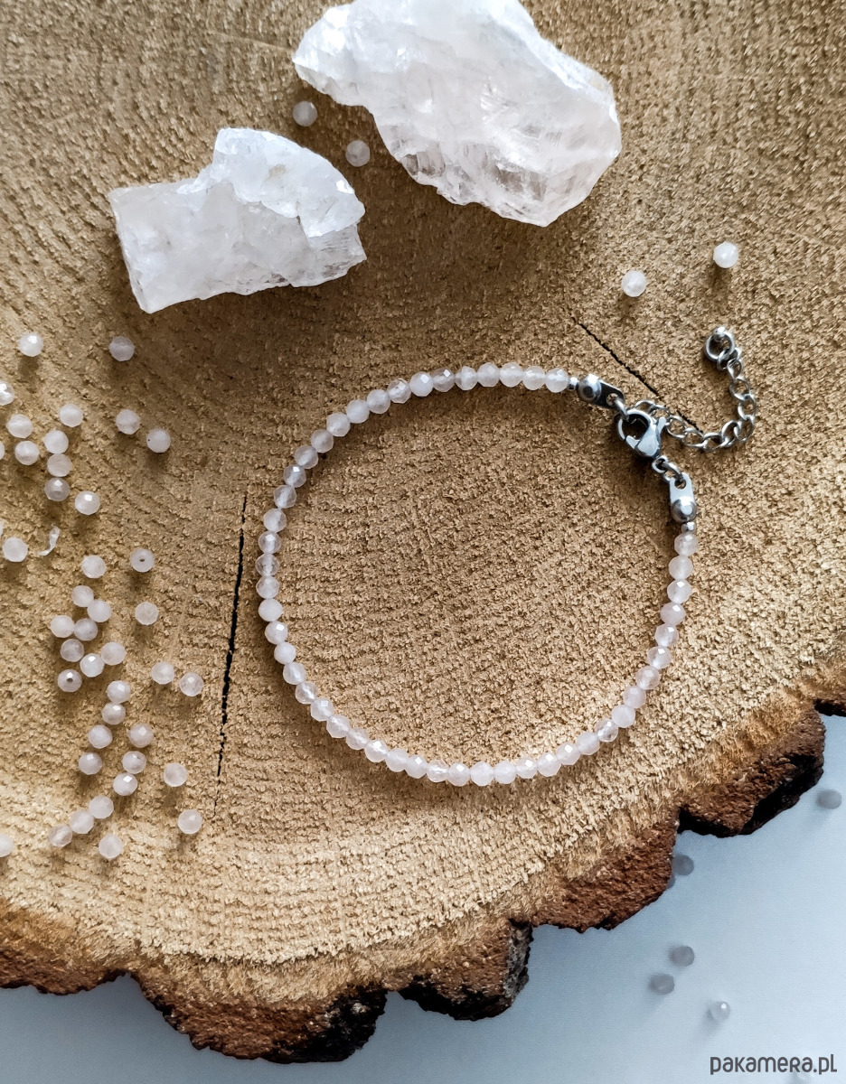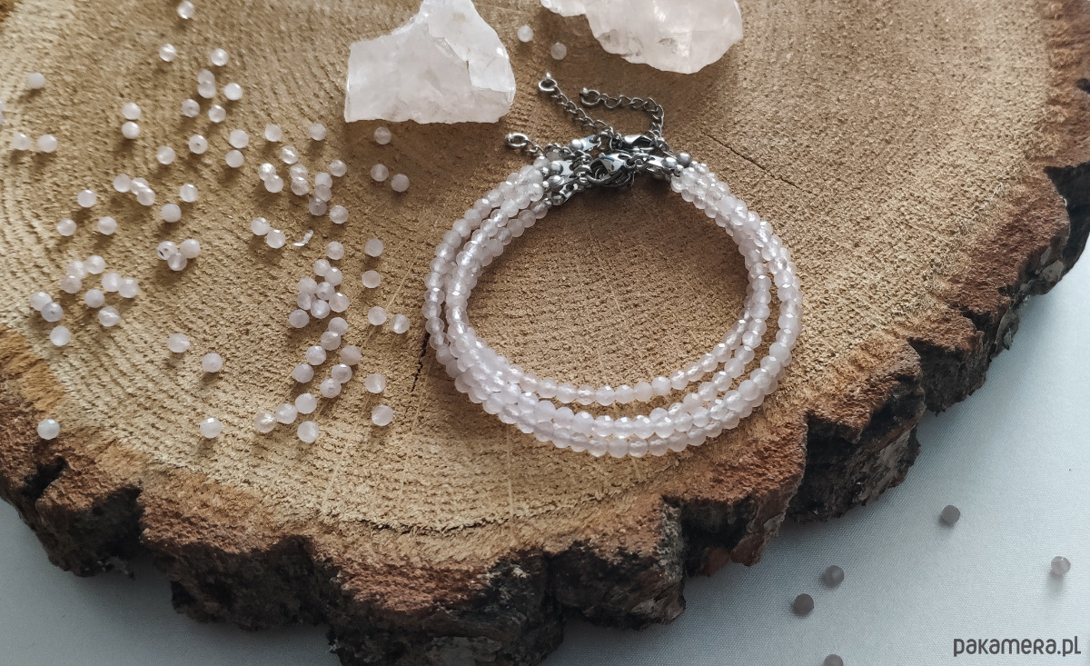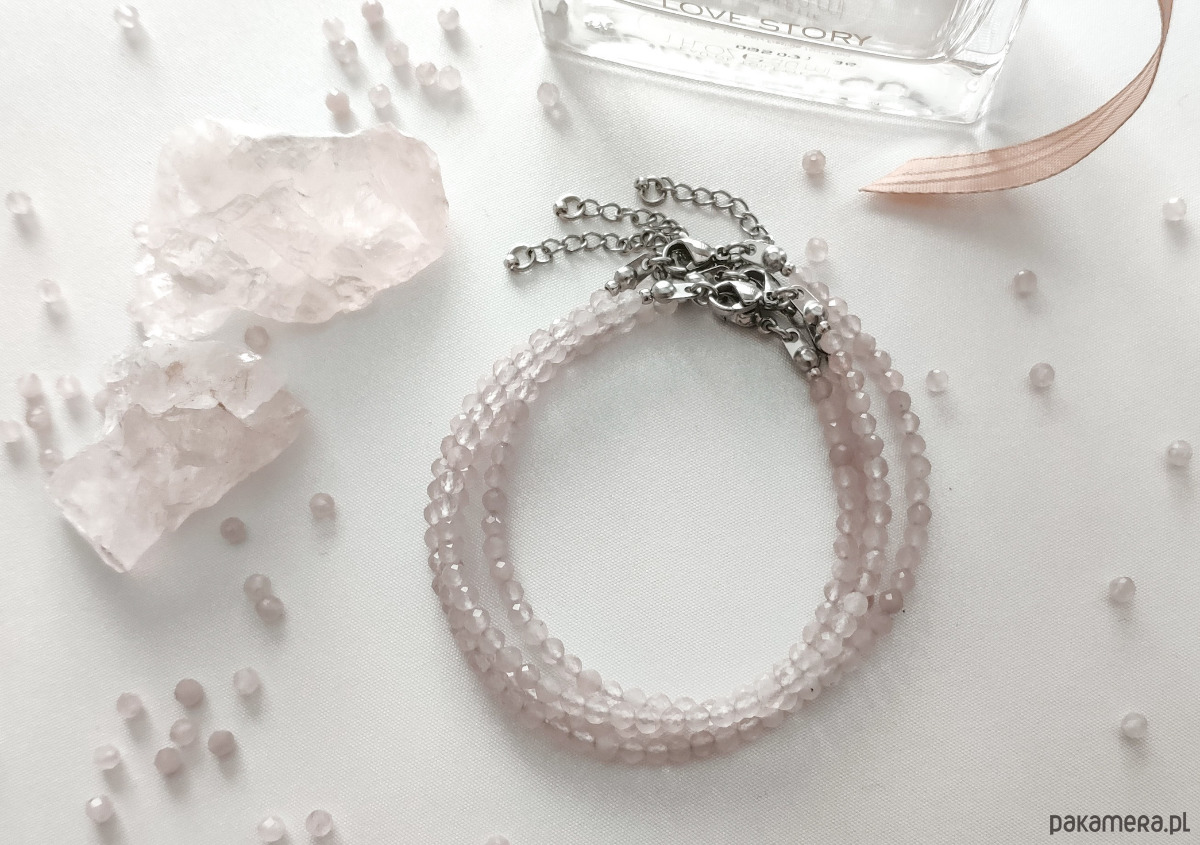 Delikatna, jasnoróżowa bransoletka z niezwykłym minerałem - kwarcem różowym, zwanym Kamieniem Miłości. Drobne kamienie o fasetowym szlifie pięknie odbijają światło, dzięki czemu bransoletka idealnie wpisuje się w trend minimalistycznej, a jednocześnie eleganckiej biżuterii. Poszczególne minerały delikatnie różnią się stopniem połysku, przypominając momentami "oszronioną" powierzchnię. Dzięki temu całość prezentuje się niebanalnie i podkreśla naturalną formę kamieni.