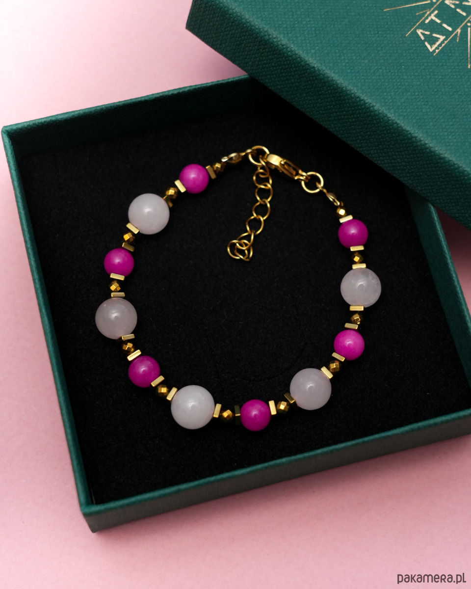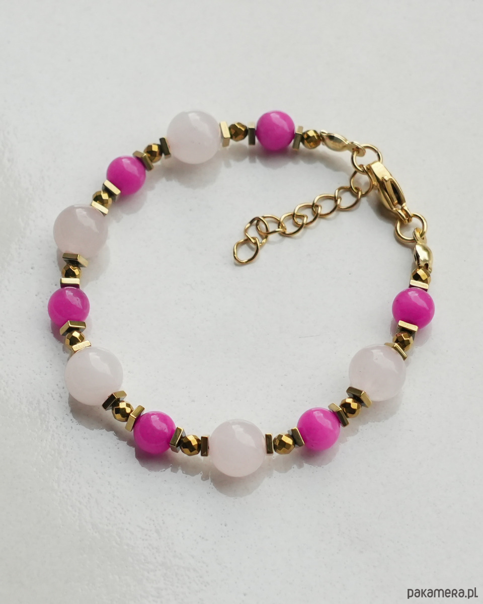 Ozdobna, kolorowa bransoletka wykonana z blado-różowego KWARCU RÓŻOWEGO i fuksjowego JADEITU oraz złotego HEMATYTU. Zapięcie i łańcuszek to STAL SZLACHETNA w kolorze złotym. Idealna na przełamanie szarej, jesiennej aury :)