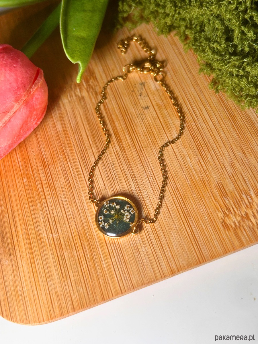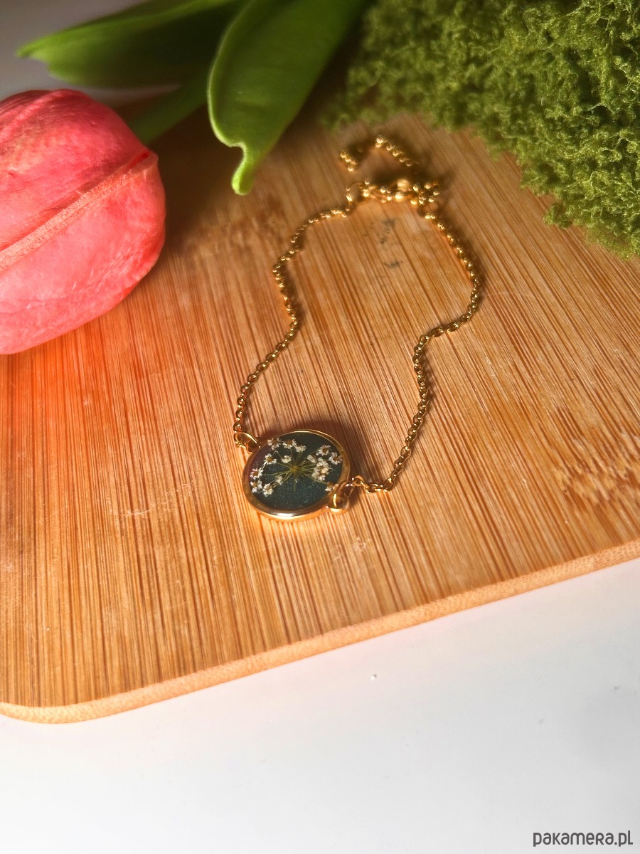 Delikatna, a jednocześnie wyrazista regulowana bransoletka z naturalnymi kwiatami, zatopionymi w żywicy na tle głębokiej butelkowej zieleni. Każdy egzemplarz jest unikatowy – układ kwiatów tworzy niepowtarzalną, organiczną kompozycję inspirowaną naturą.