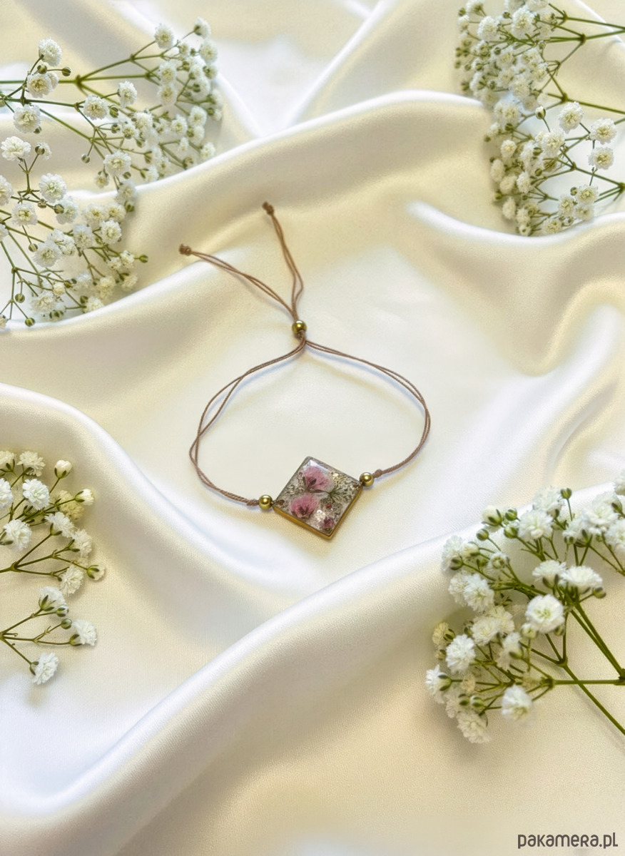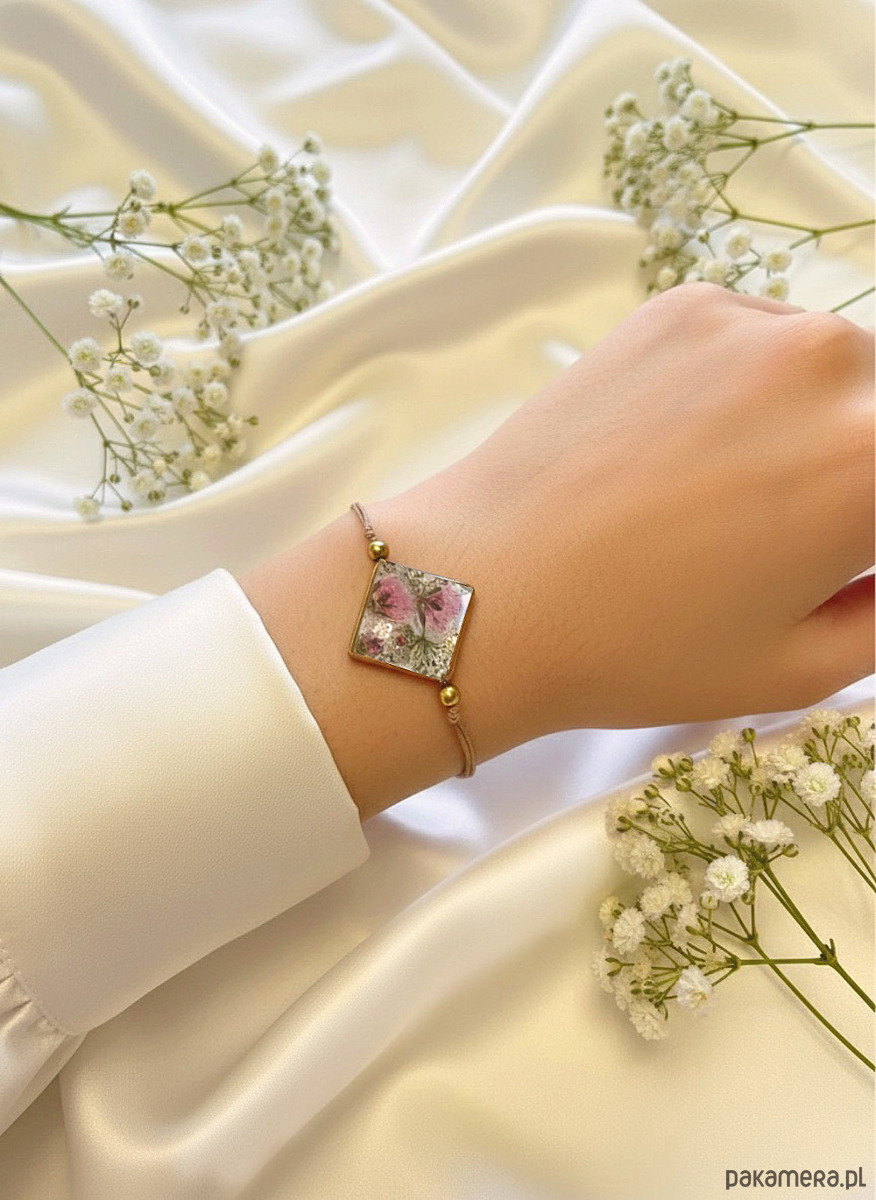 Ta subtelna, ręcznie tworzona bransoletka kryje w sobie zaklęty w żywicy fragment natury. W kwadratowej, złotej oprawie znajdują się prawdziwe, różowe kwiaty zachowane tak, by wyglądały jak świeżo zerwane. Całość uzupełniają złote kuleczki, które dodają elegancji i podkreślają szlachetny charakter biżuterii.