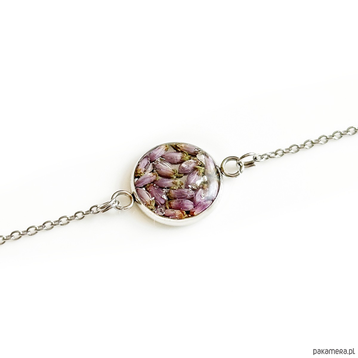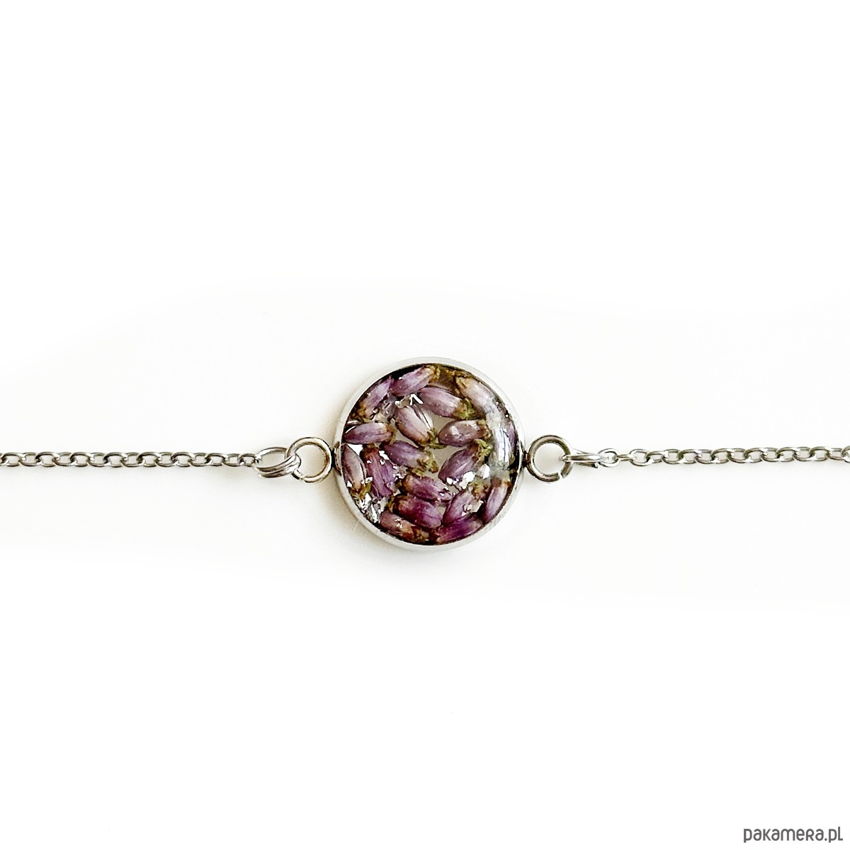 Bransoletka z dziką marchwią jest wykonana ze stali szlachetnej oraz żywicy epoksydowej.