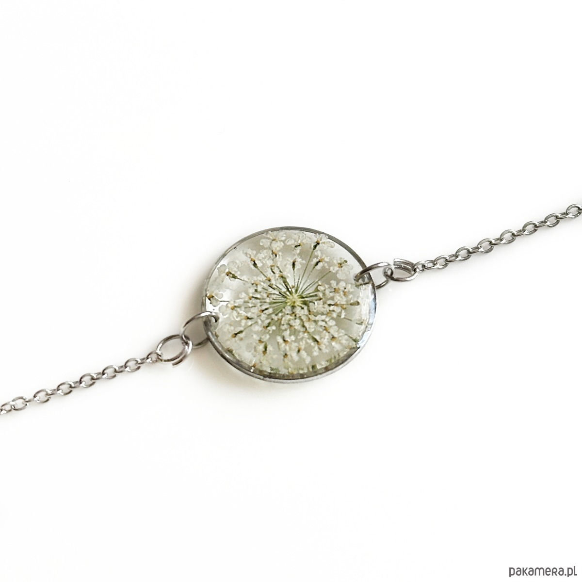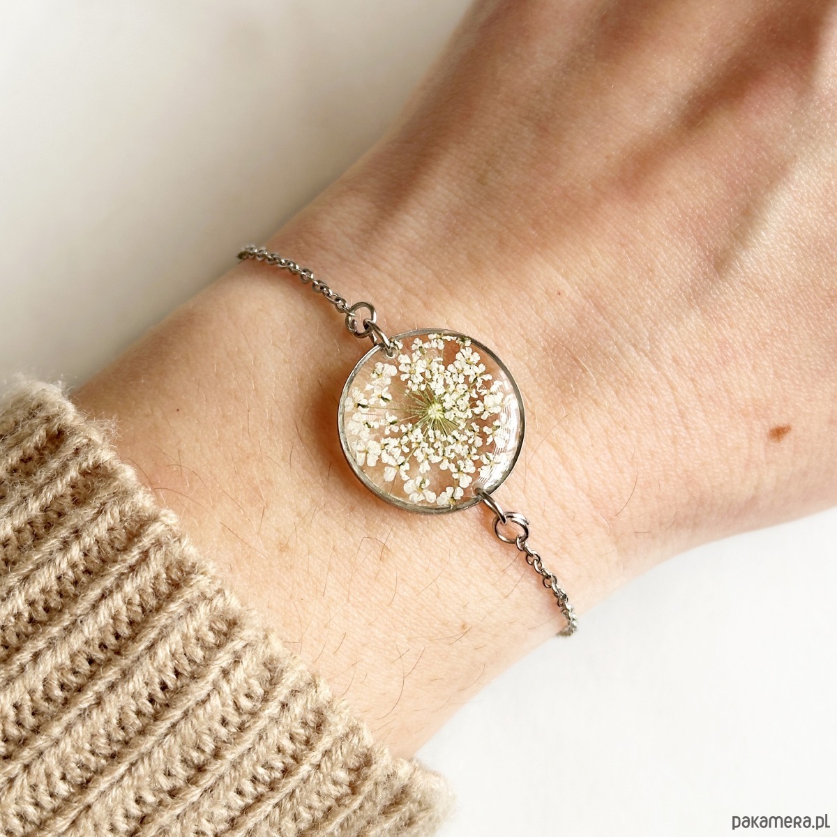 Bransoletka z dziką marchwią jest wykonana ze stali szlachetnej oraz żywicy epoksydowej.